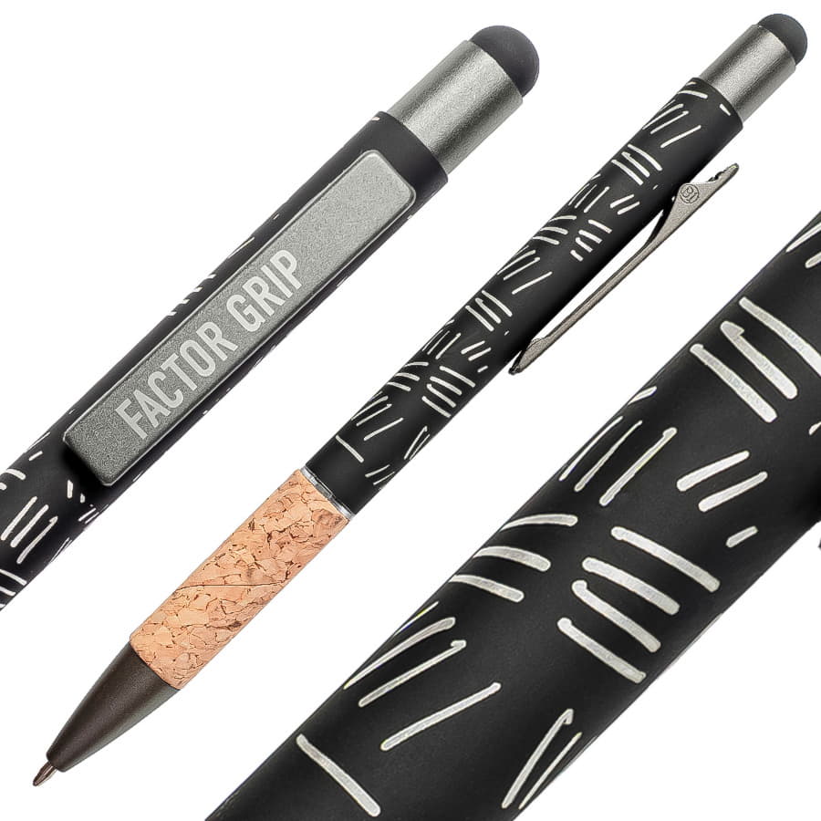 Стиль, изящность линий и качество – 3 основных компонента, на которые была сделана ставка при разработке данной модели ручки. Благодаря специальной грип зоне из натуральной пробки ручку приятно и удобно держать в руке. Чернила легко ложатся на бумагу и быстро высыхают. Надежный стальной пищущий узел с шариком из карбида вольфрама – гарантия долгой службы. Дизайн ручки сочетает в себе сдержанность со скрытой внутренней энергией. А корпус и эксклюзивный клип идеально подходят под персонализацию. • Pantone, близкий к Black• Размер 140*10 мм• Корпус из алюминия с покрытием soft touch• Стилус черного цвета• Металлический клип-прищепка серого цвета • Пластиковые носик и кнопка в цвет клипа• Грип из натуральной пробки• Нажимной механизм подачи стержня• Пулевидный пишущий узел 1.0 мм• Длина линии письма 1000 м • Чернила Dokumental. Цвет чернил синий• Сменный стержень Parker type• При гравировке вскрывается натуральный цвет алюминия, который может быть либо более белый, либо более серого оттенка -