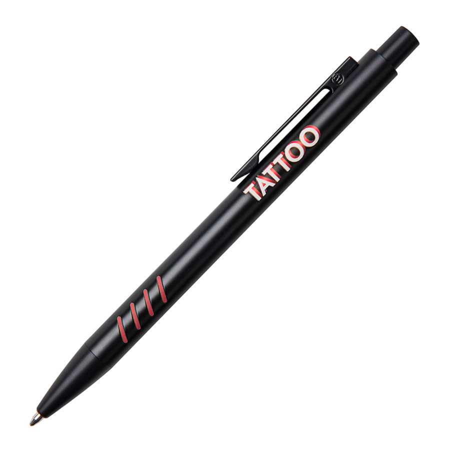 Цветные грип-вставки, контрастирующие с полностью черным корпусом - не единственная особенность TATTOO. На этой ручке возможна двухцветная 3D-гравировка. Зеркальная подложка в цвет прорезиненных вставок в сочетании с белым матовым покрытием позволяют получить эффект объема при нанесении логотипа или рекламного сообщения. Pantone, близкий к 180С.Стержень Plastic Parker Type, 1 мм, синий. -