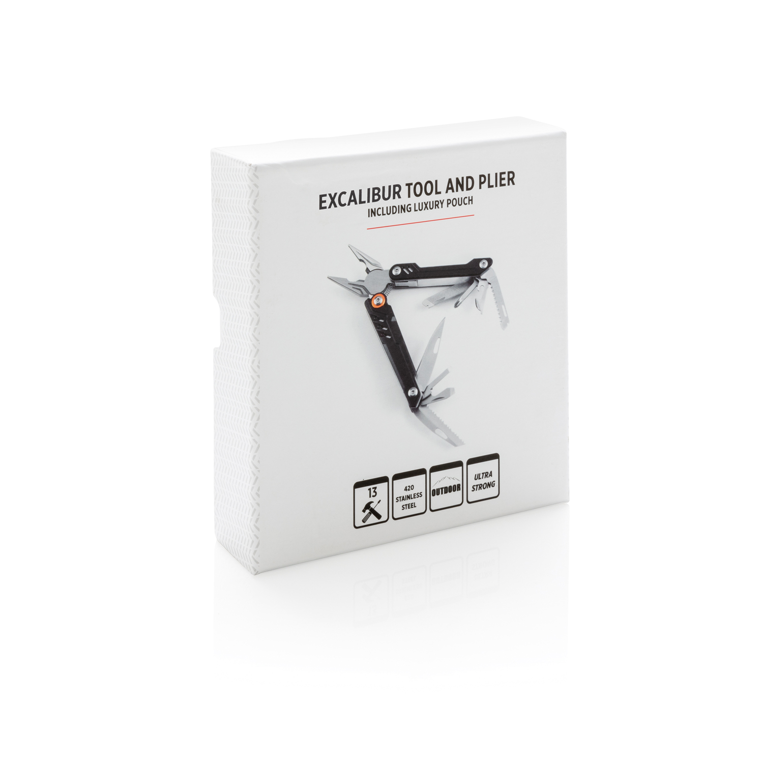 Сверхпрочный мультитул с 13 функциями. Упакован в роскошную подарочную упаковку, в комплект поставки также входит мешочек из высококачественного полиэстера плотностью 1680D. Корпус выполнен из алюминия, а инструменты – из нержавеющей стали. В мультитуле предусмотрены: длинногубцы, плоскогубцы, кусачки, зубчатый нож, штопор, большая плоская отвертка, средняя плоская отвертка, нож, напильник, крестообразная отвертка, консервный нож, малая плоская отвертка, пилка.