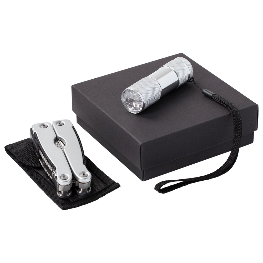 фонарик - алюминий; мультитул: инструменты - нержавеющая сталь; рукоятки - алюминий; чехол - полиэстер; коробка - картон