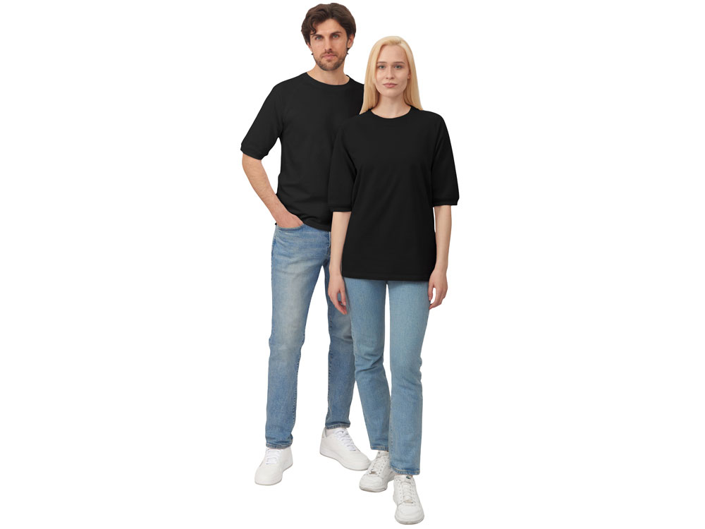 Футболка выполнена из хлопкового френч терри с петельками на изнаночной стороне. Горловина обработана рибом 2х2 и дополнительно усилена тесьмой-елочкой с внутренней стороны спинки и дополнена кокеткой по спинке для нанесения логотипа клиента. Рукав реглан продублирован рибом по низу. Разрезы в боковых швах. Гладкая поверхность полотна позволяет идеально нанести изображение. Футболка комфортного силуэта.