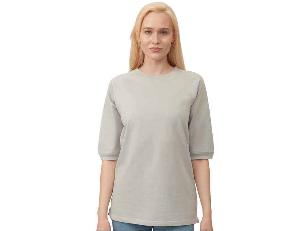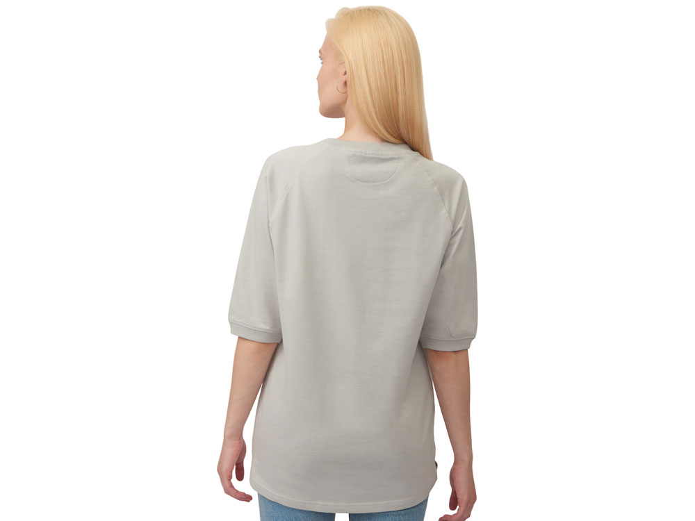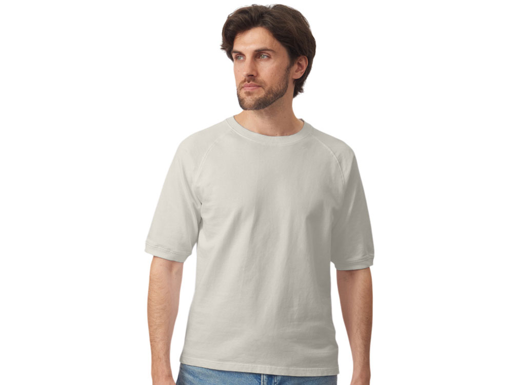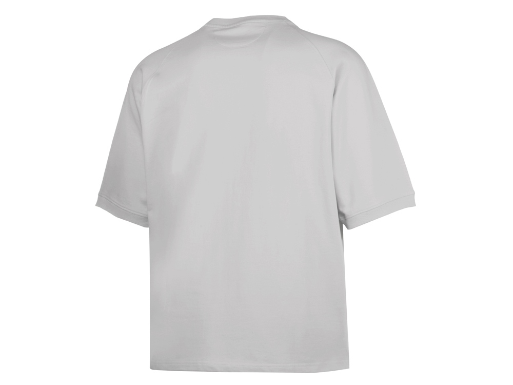 Футболка выполнена из хлопкового френч терри с петельками на изнаночной стороне. Горловина обработана рибом 2х2 и дополнительно усилена тесьмой-елочкой с внутренней стороны спинки и дополнена кокеткой по спинке для нанесения логотипа клиента. Рукав реглан продублирован рибом по низу. Разрезы в боковых швах. Гладкая поверхность полотна позволяет идеально нанести изображение. Футболка комфортного силуэта.