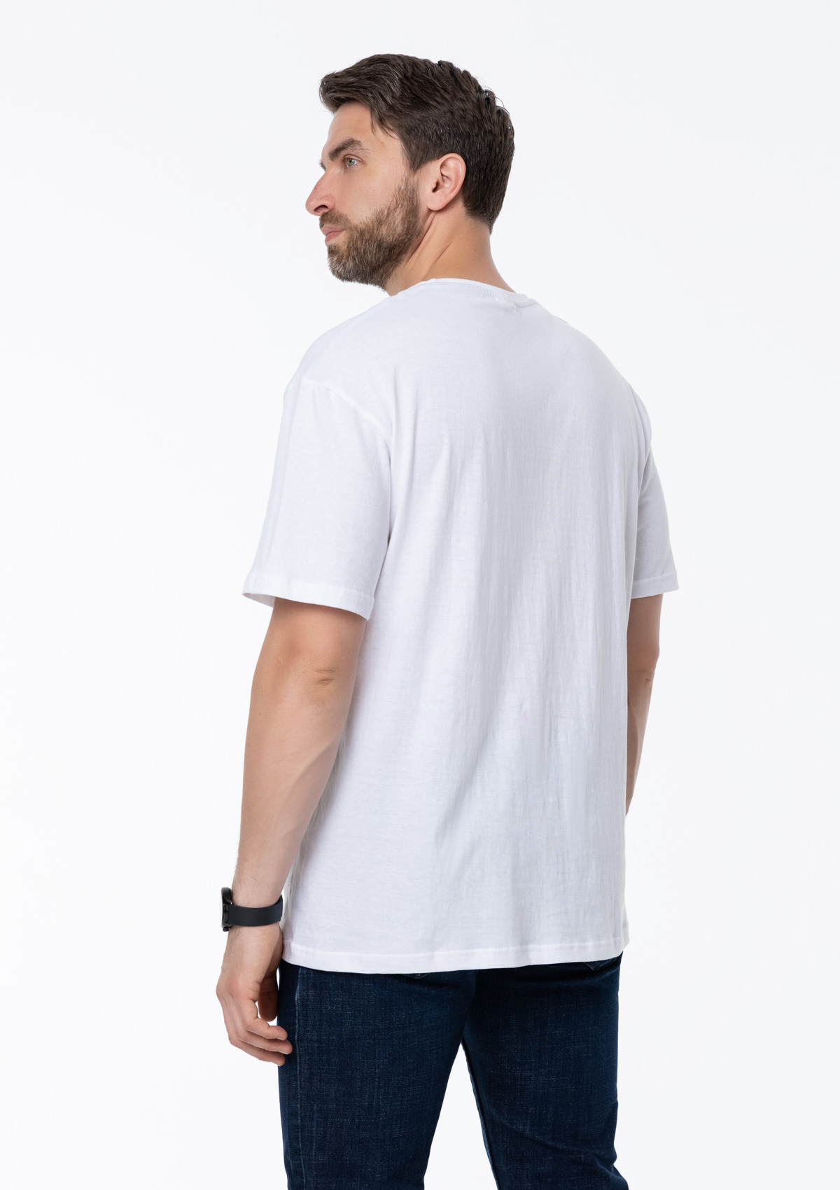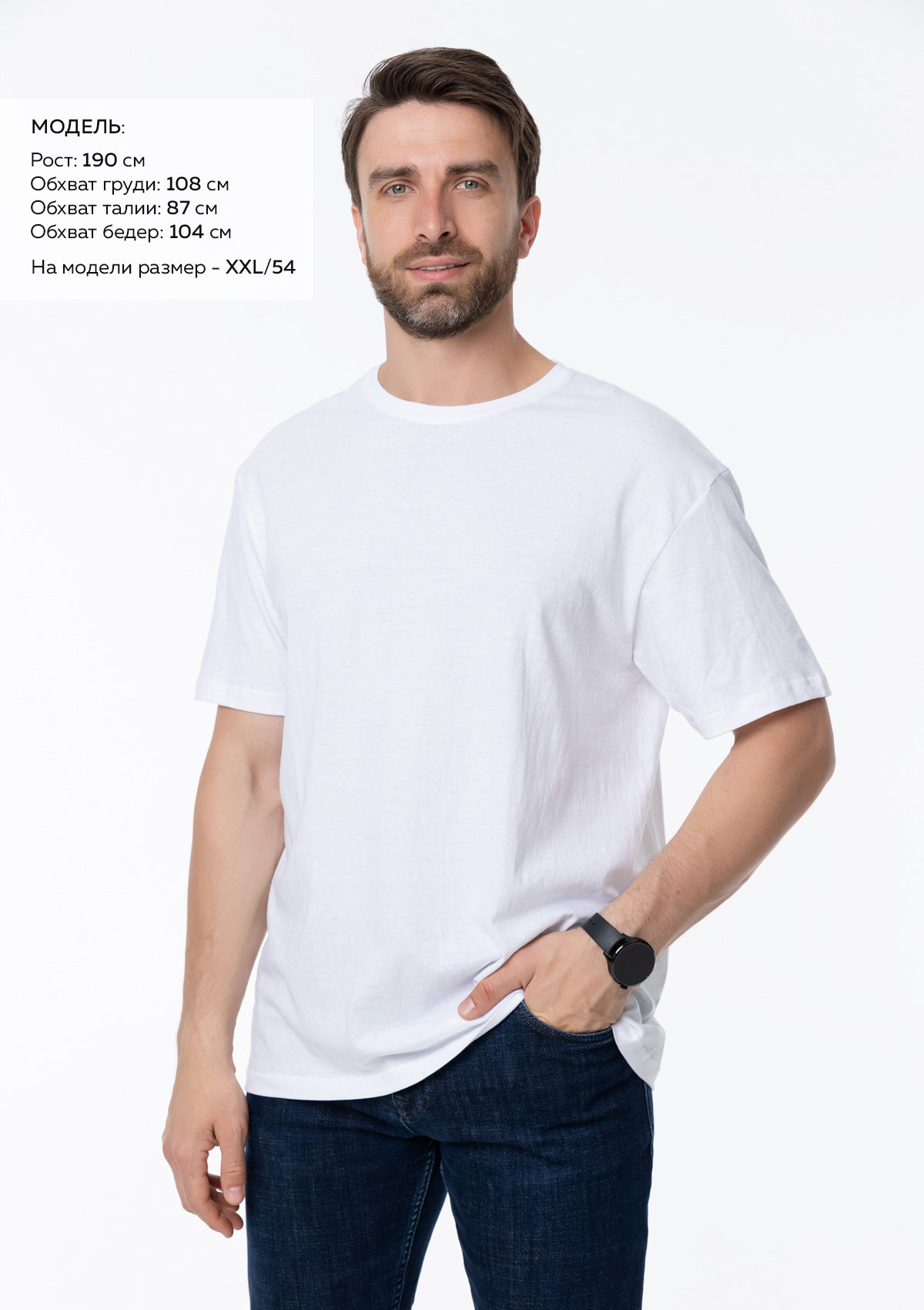 Размер мужской футболки: XXL/54. Параметры модели: рост 190 см.; обхват груди 108 см.; обхват талии 87 см.; обхват бедер 104 см.