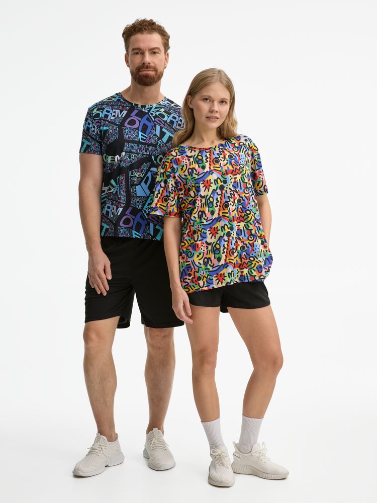 Футболка унисекс прямого силуэта дарит исключительное удобство и приятные ощущения. Ткань нежно прилегает к телу, а ее мягкая поверхность напоминает бархатистую кожицу персика благодаря специальной обработке с эффектом peach touch («прикосновение персика»). Смешанный состав из полиэстера с небольшим добавлением эластана делает футболку идеальным выбором для любых спортивных активностей и просто динамичной жизни: материал хорошо пропускает воздух, быстро сохнет и хорошо тянется.