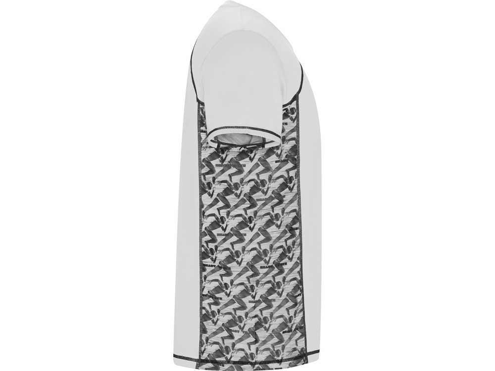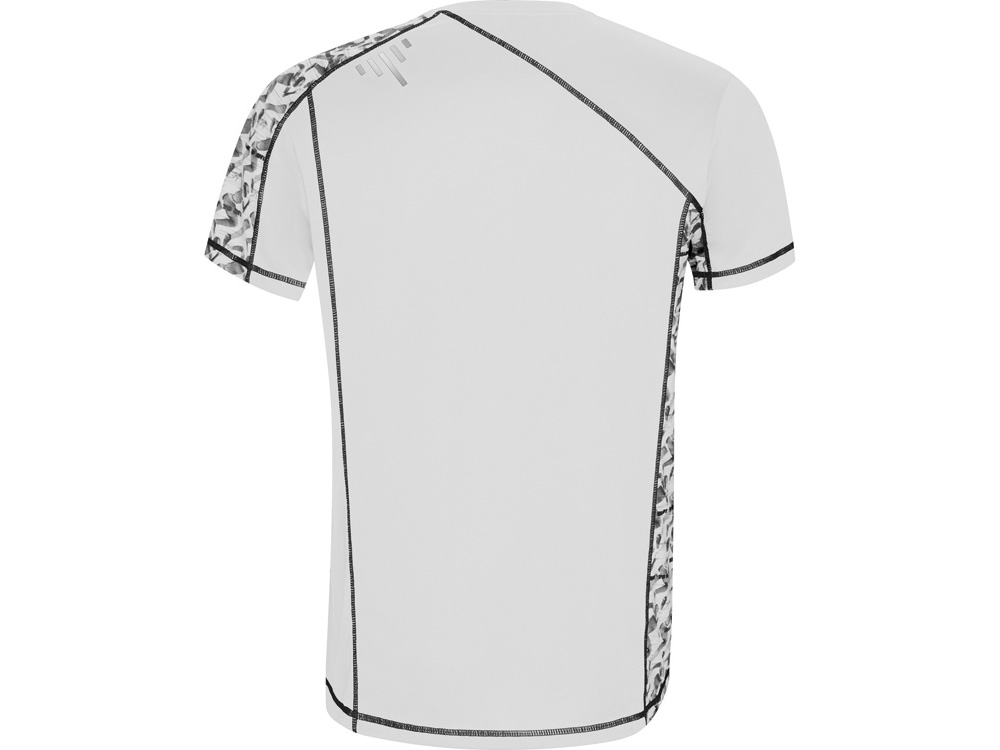 Спортивная футболка с коротким рукавом и принтованными вставками. Контрастные отстрочки плоским швом, светоотражающие элементы на полочке и спинке. Эко лейбл на рукаве.