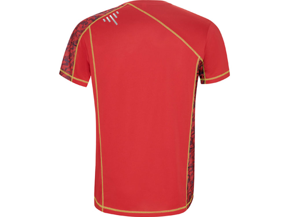 Спортивная футболка с коротким рукавом и принтованными вставками. Контрастные отстрочки плоским швом, светоотражающие элементы на полочке и спинке. Эко лейбл на рукаве.