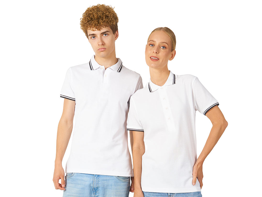 Рубашка-поло Erie с окантовкой. Воротник и манжеты резинка 1х1. Мужская модель с двумя пуговицами, женская - 4 пуговицы в тон изделия. Обшивка внутри воротника. Женская модель с разрезами по бокам. Женская модель приталена. Пике, 100% чесаный хлопок. Плотность 180 г/м2. -