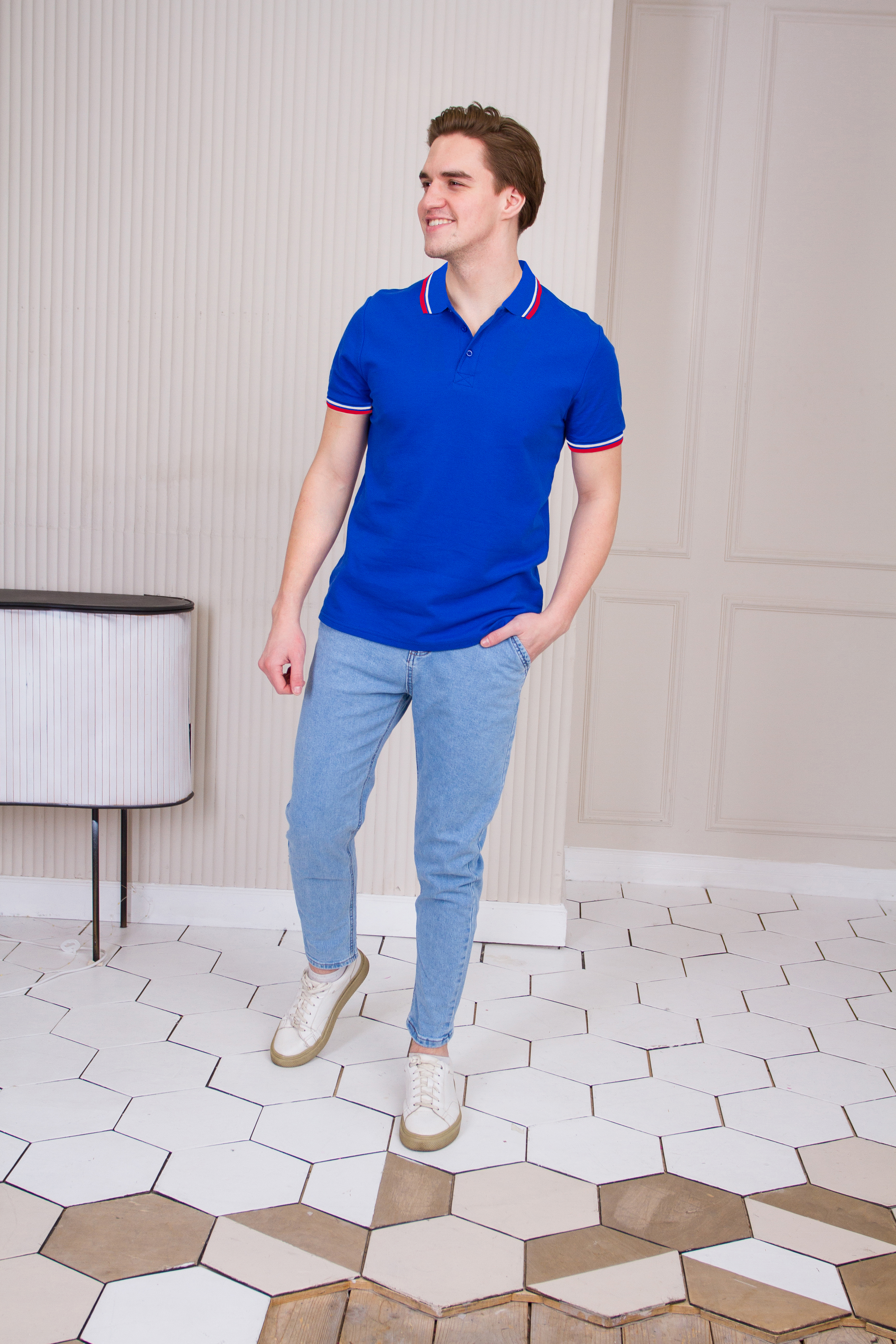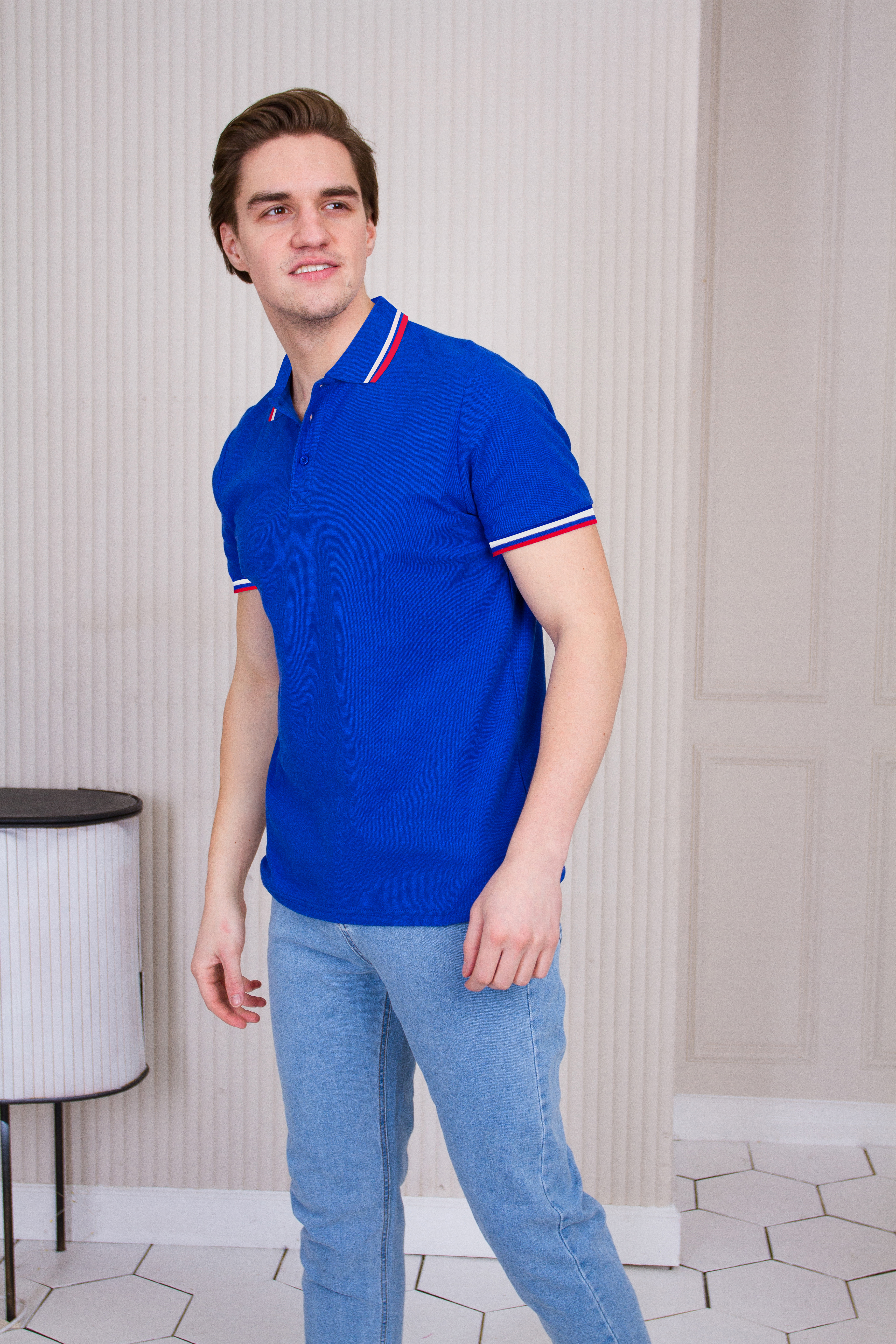 Мужская рубашка поло прямого силуэта с отложным воротником, втачным коротким рукавом и застежкой на пуговицы. Воротник и манжет оформлены тесьмой в цвете «триколор».