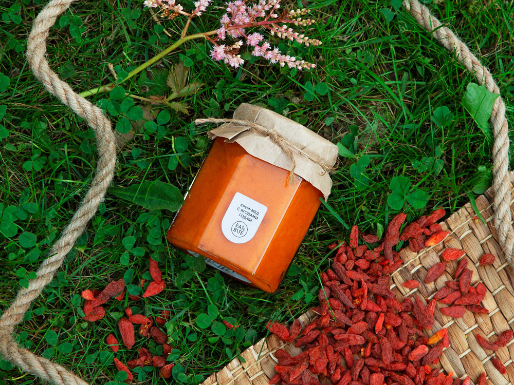 Крем-мёд это настоящий десерт для сладкоежек. Благодаря своей структуре он идеально подходит как топпинг, который легко намазать и не бояться, что он растечется по тарелке. Ягоды годжи добавляют к десерту отличный состав полезных минералов и витаминов. -