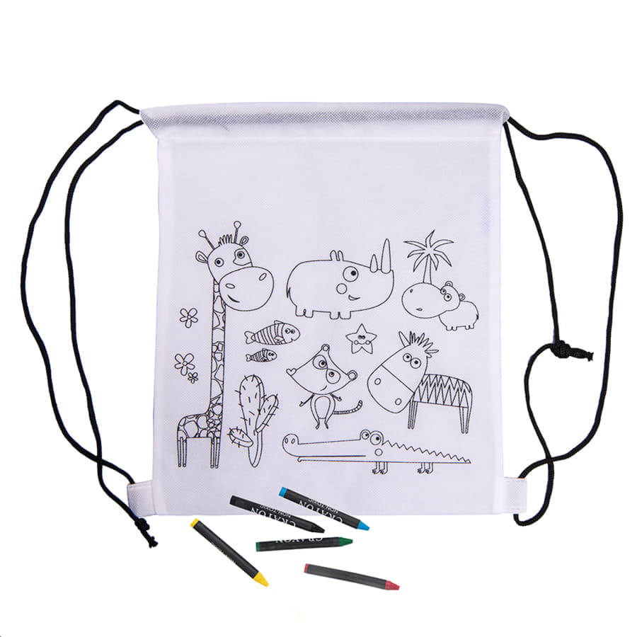 Рюкзак из нетканого материала белого цвета, специально созданный для раскрашивания мелками. В набор входят 5 цветных мелков: синий, красный, зеленый, желтый, черный.Черные ручки-кулисы, усиление по углам. -