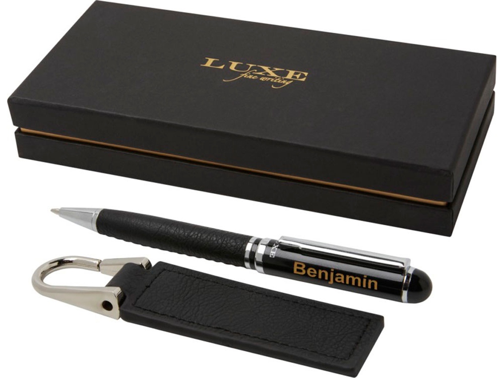 Подарочный набор включает шариковую ручку и брелок-петлю с элегантным дизайном. Шариковая ручка предварительно заполнена синими чернилами. Упакована в подарочную коробку LUXE. Латунь, PU пластик.