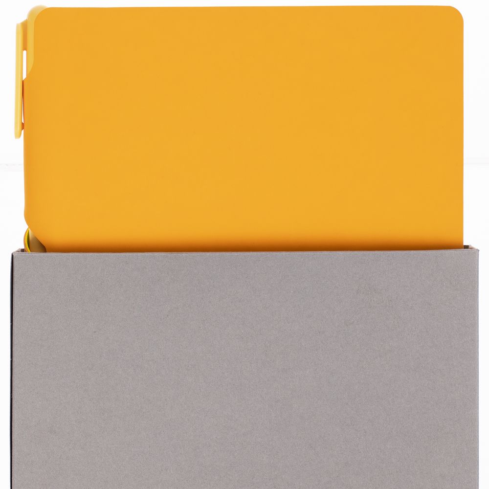 Удобный ежедневник с гибкой обложкой и местом под ручку в корешке, миниатюрная ручка из переработанного пластика и компактная самосборная коробка — простые составляющие полезного делового набора. -
