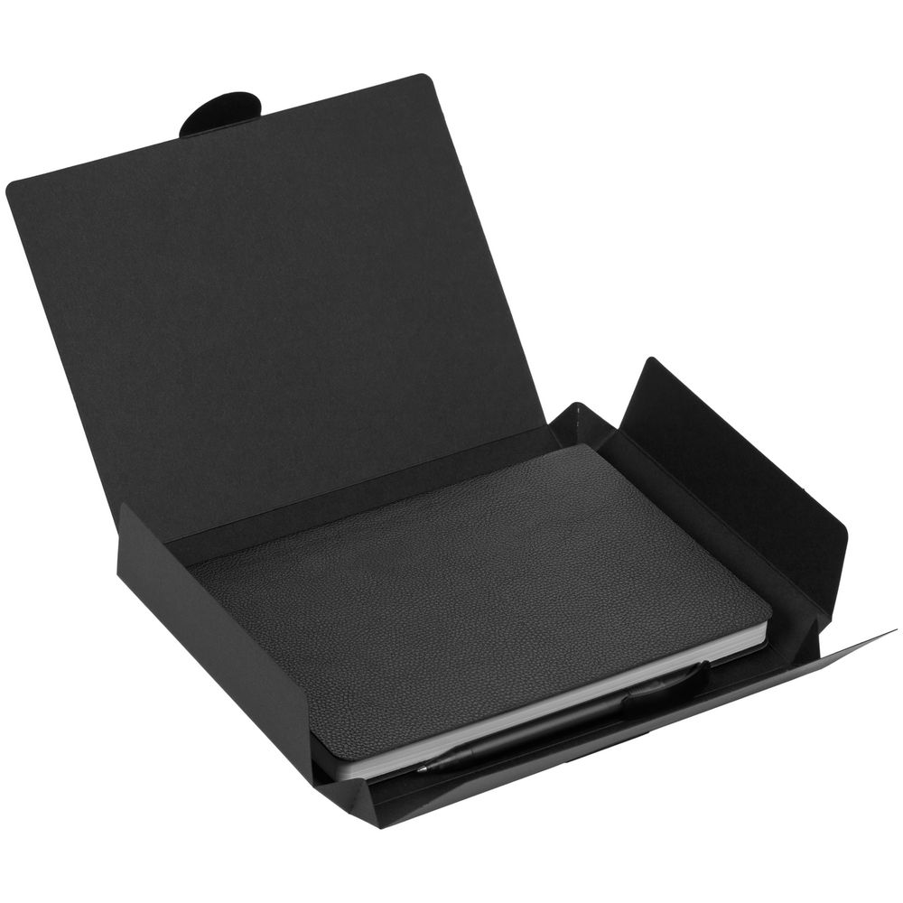 Недатированный ежедневник с гибкой обложкой из фактурного материала La Fite и металлическим шильдом на ляссе и ручка в тон, упакованные в подарочную коробку из дизайнерского картона. -