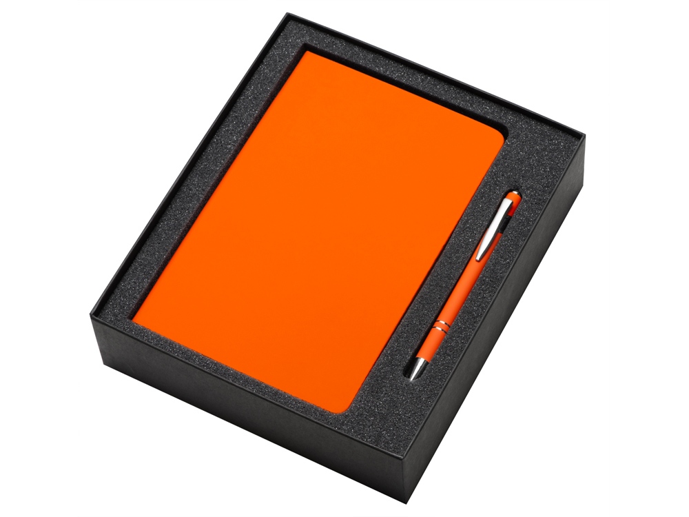ручка - металл c покрытием soft-touch, блокнот - искусственная кожа, коробка - кашированный картон
