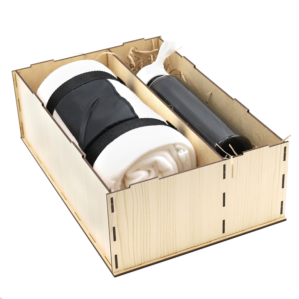 Очень изящный подарочный набор, гармонично сочетающий в себе традиции и современные тенденции! Упаковка из древесноволокнистной плиты высокой плотности (ХДФ/HDF) обеспечивает удобство погрузки и разгрузки, сохранность в пути. Состав набора: Упаковка из древесноволокнистной плиты (2 отделения) (Артикул: 53054) - 1 шт. Пластиковая бутылка Rama - 1 шт. (Артикул: 14014.01) Плед Арго- 1 шт. (Артикул: 16000.01) Наполнитель - стружка бумажная, бежевый – 1 шт. (артикул: 62000.13)- Виды нанесений: Гравировка А1, УФ-печать, Круговая УФ-печать, Гравировка круговая, Термотрансфер DTF, Вышивка, Шелкотрансфер
