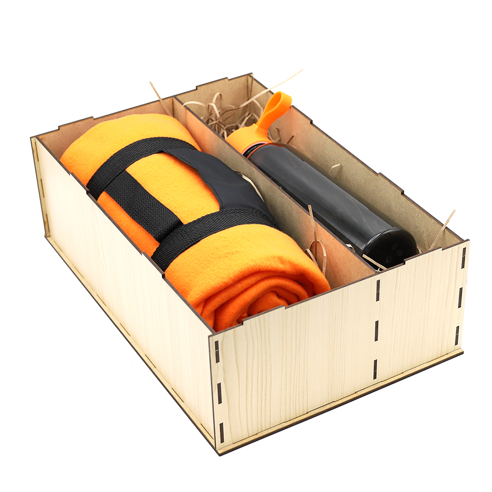 Очень изящный подарочный набор, гармонично сочетающий в себе традиции и современные тенденции! Упаковка из древесноволокнистной плиты высокой плотности (ХДФ/HDF) обеспечивает удобство погрузки и разгрузки, сохранность в пути. Состав набора: Упаковка из древесноволокнистной плиты (2 отделения) (Артикул: 53054) - 1 шт. Пластиковая бутылка Rama - 1 шт. (Артикул: 14014.07) Плед Арго - 1 шт. (Артикул: 16000.07) Наполнитель - стружка бумажная, бежевый – 1 шт. (Артикул: 62000.13)- Виды нанесений: Гравировка А1, УФ-печать, Круговая УФ-печать, Гравировка круговая, Термотрансфер DTF, Вышивка, Шелкотрансфер