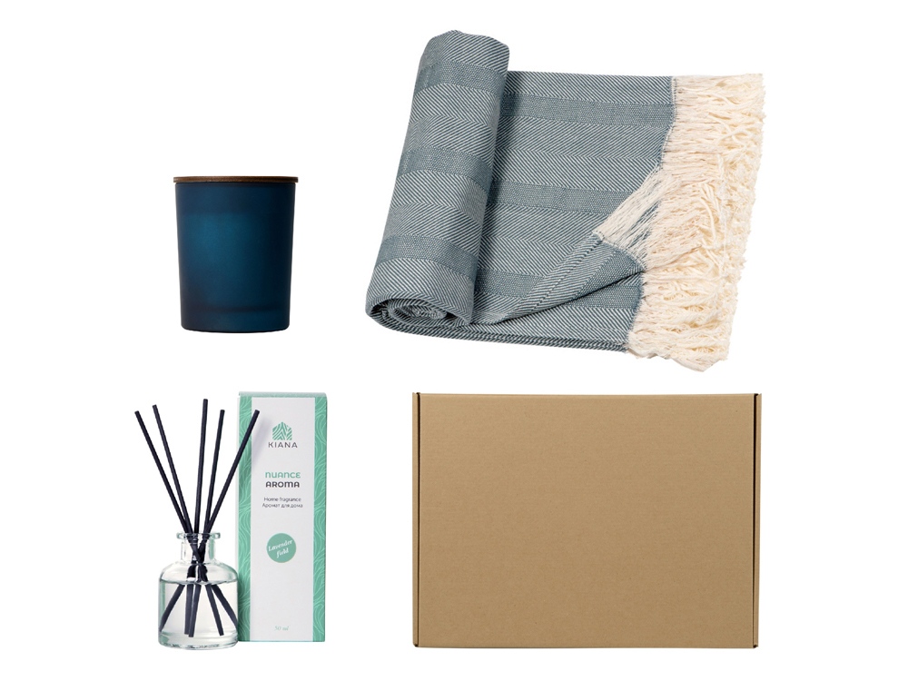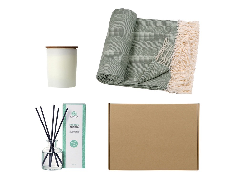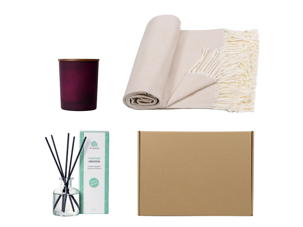 плед - 100% хлопок, аромат для дома - стекло, фибровые палочки, свеча - воск, стекло, дерево, коробка - картон