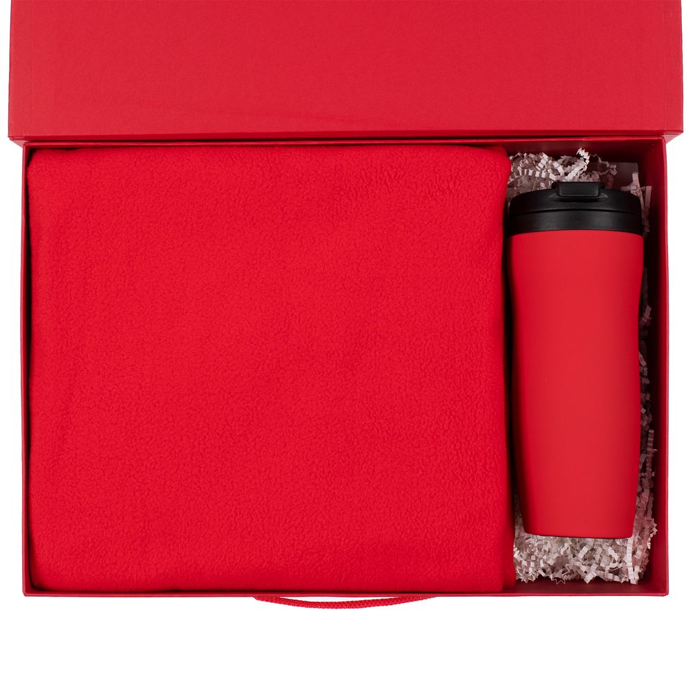 покрытие софт-тач; термостакан - пластик, крышка, внутренняя колба; нержавеющая сталь, корпус; плед - флис, плотность 180 г/кв.м; коробка - переплетный картон; наполнитель - бумага