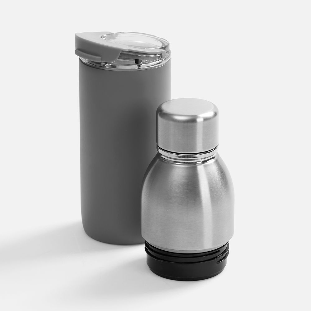 Varianti — это яркий пример посуды с двойной функциональностью. Один и тот же корпус можно превратить как в термостакан для чая и кофе с пластиковой крышкой, так и в термобутылку для прохладительных напитков — с крышкой стальной.