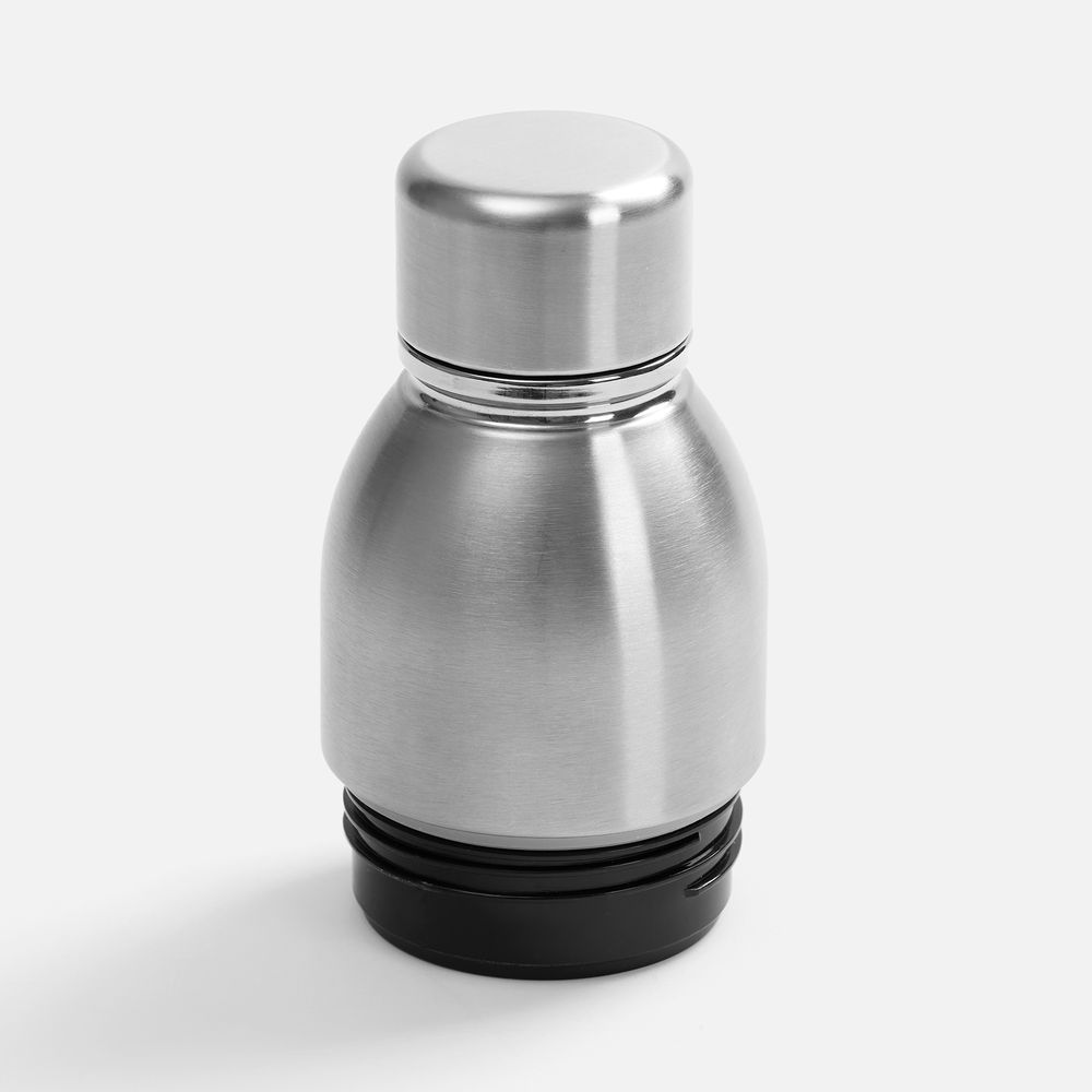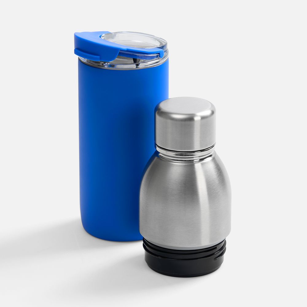 Varianti — это яркий пример посуды с двойной функциональностью. Один и тот же корпус можно превратить как в термостакан для чая и кофе с пластиковой крышкой, так и в термобутылку для прохладительных напитков — с крышкой стальной.