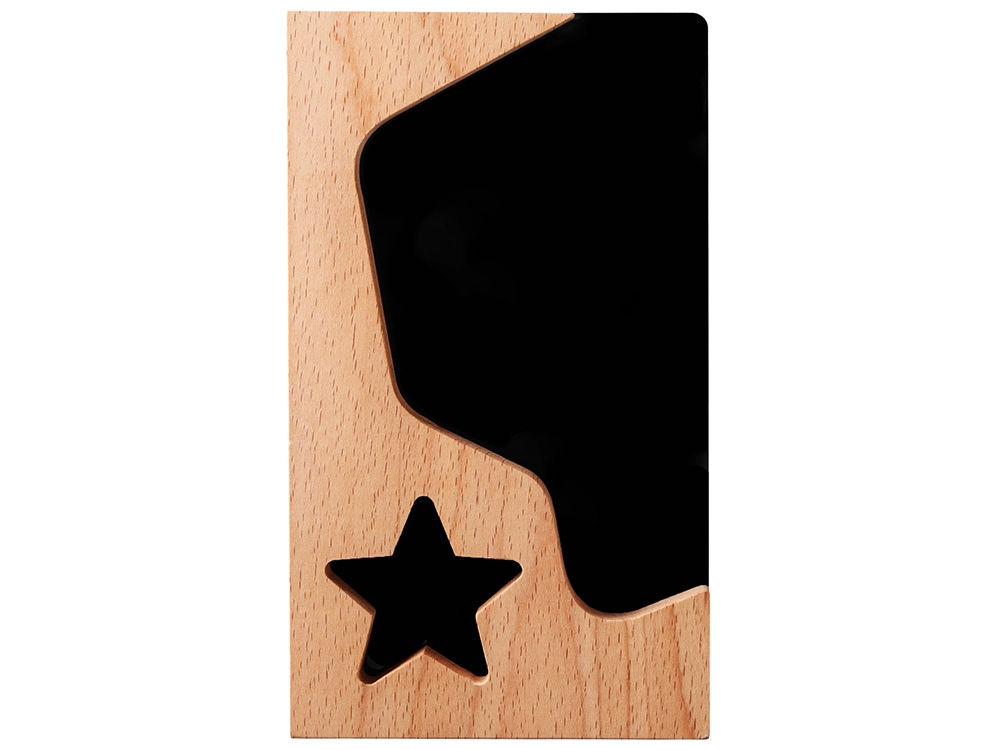 Красивая и современная награда для главных звезд любой компании. Черный акрил добавляет контраста рамке из бука, логотип или наградную надпись можно выгравировать на деревянной части или сделать уникальный дизайн, благодаря полной запечатке акрила методом УФ-печати. -