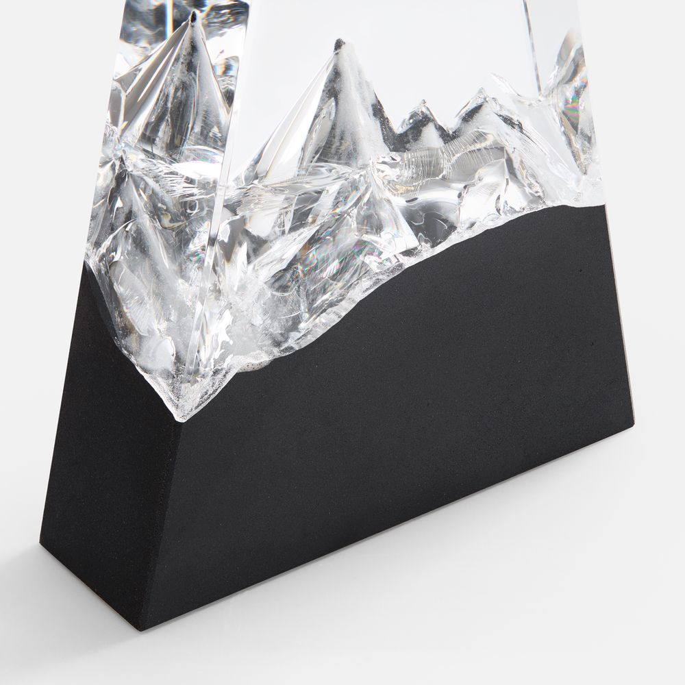 Нижняя часть стелы выполнена при помощи каменного литья из смеси специальной смолы с кварцевым черным и белым песком, тщательно отшлифованной после спекания при низкой температуре. Такой технологический прием создает завораживающую картинку внутри самой стелы, напоминающую горный хребет: яркий символ как преодоления, так и умиротворения.