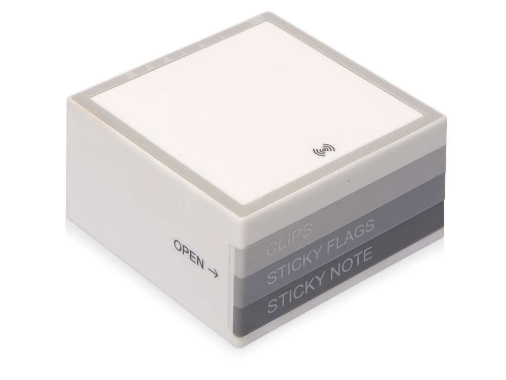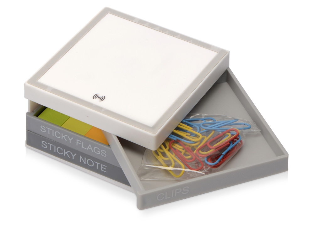 Органайзер Chaos с функцией беспроводной зарядки – современный бизнес-подарок, объединяющий в себе функциональность и современный подход к организации рабочего пространства. Три выдвигающиеся подставки уже содержат скрепки, самоклеящиеся стикеры и стикеры-закладки. Органайзер подходит для беспроводной зарядки и хранения смартфона, поддерживающего функцию беспроводной зарядки, и различных канцелярских аксессуаров. Работает от кабеля Micro-USB. В комплект входит кабель Micro-USB. -
