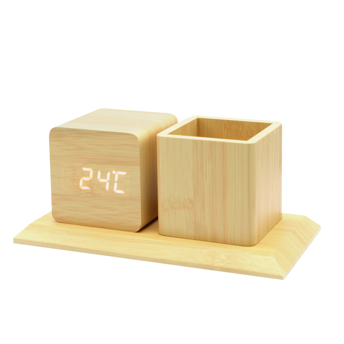 Многофункциональные деревянные часы с белой подсветкой и подставкой под канцелярские принадлежности. Функции: часы, дата, температура, 3 режима будильника, функция управления звуком (когда функция управления звуком активирована, дисплей гаснет через 15 секунд; вы можете активировать, дисплей хлопнув в ладоши, или слегка постучав по часам). В промежуток времени 18.00-7.00 яркость подстветски снижается на 50%. Источник питания: от сети, либо с использованием 3х батареек ААА (не входят в комплект). Поставляются вместе с русскоязычной инструкцией и USB кабелем для подключения к сети. Батарейки в комплект не входят.- Виды нанесений: УФ-печать А2, Гравировка А1, УФ-Лак, УФ-Цвет+Лак
