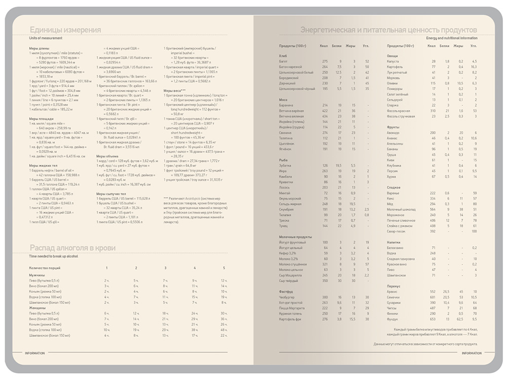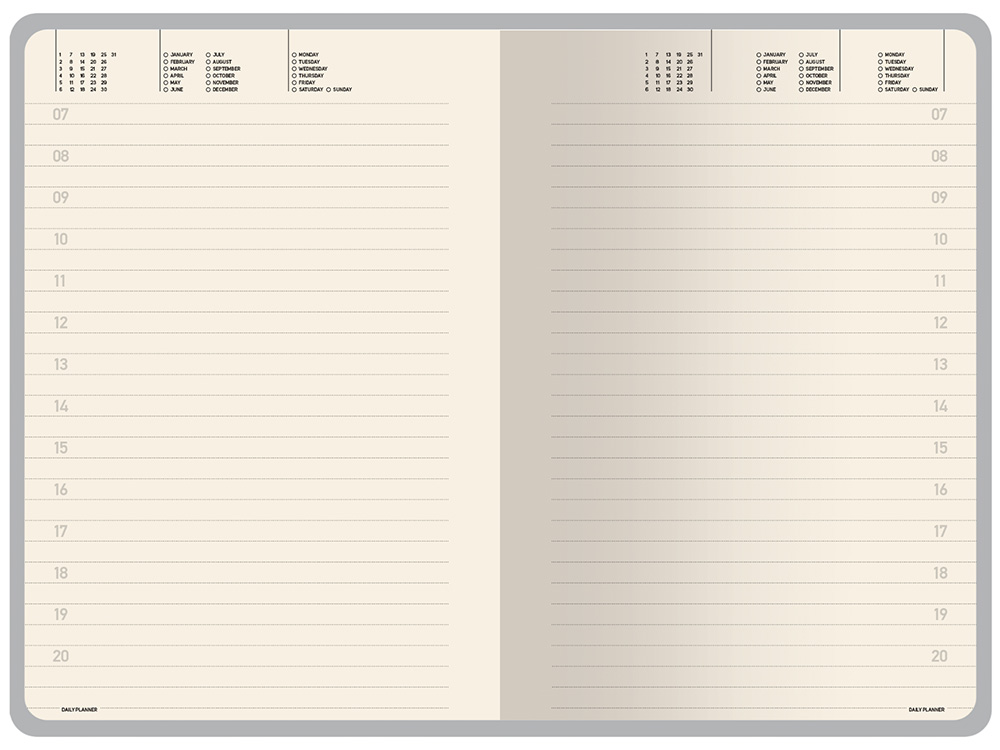Недатированные страницы в серую линейку имеют отдельное место для проставления числа месяца и дня недели. Справочный блок на 17 страницах содержит полезную информацию из различных областей.