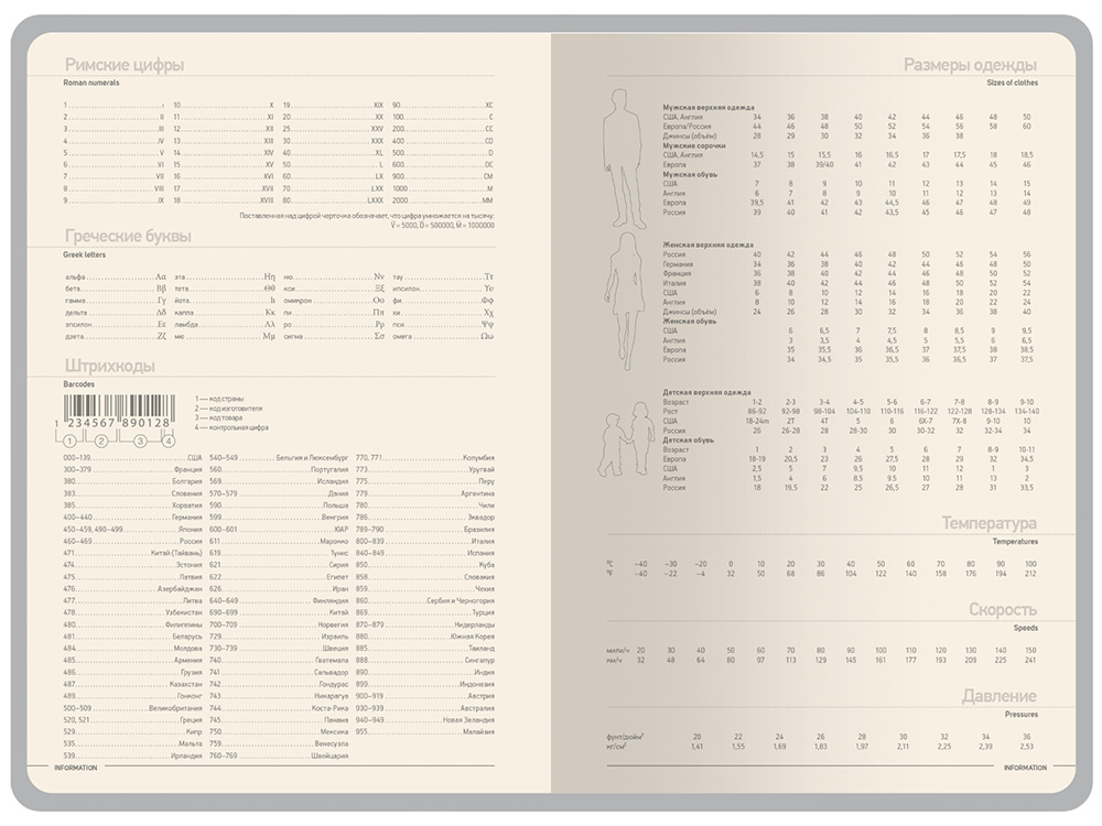 Недатированные страницы в серую линейку имеют отдельное место для проставления числа месяца и дня недели. Справочный блок на 17 страницах содержит полезную информацию из различных областей.