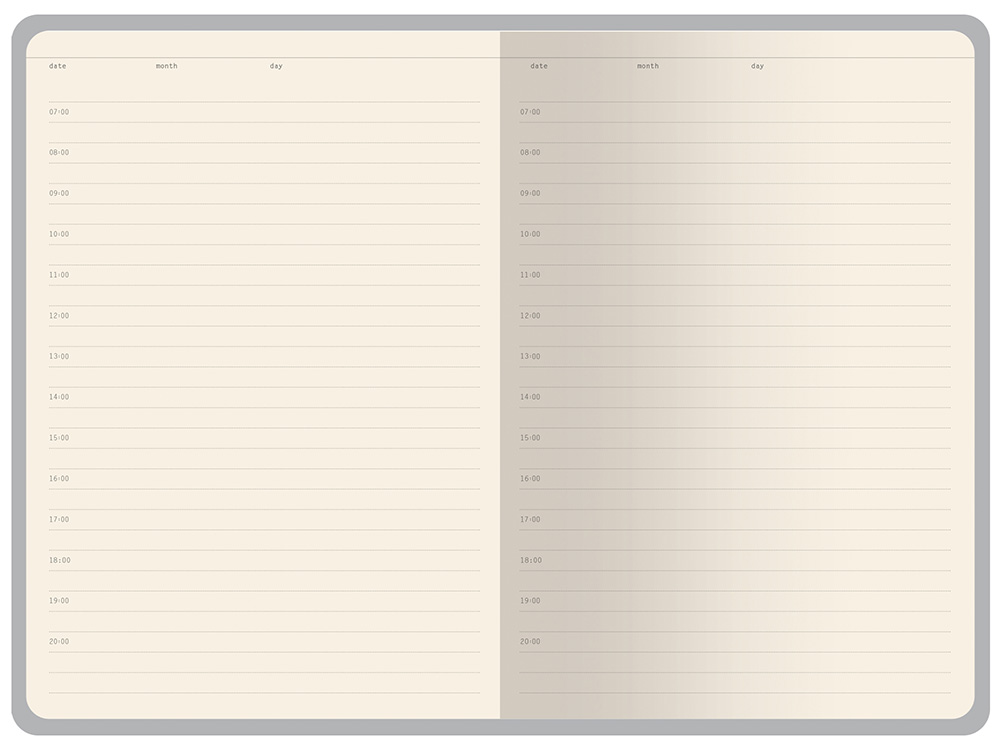Бумажный блок, закрепленный книжным переплетом, выполнен из бежевой офсетной бумаги плотностью 70 г/ кв м. Внутри блока есть страница для персональных данных, справочная информация на 13 страницах. Блок для записей имеет линовку с указанием временных интервалов в один час.