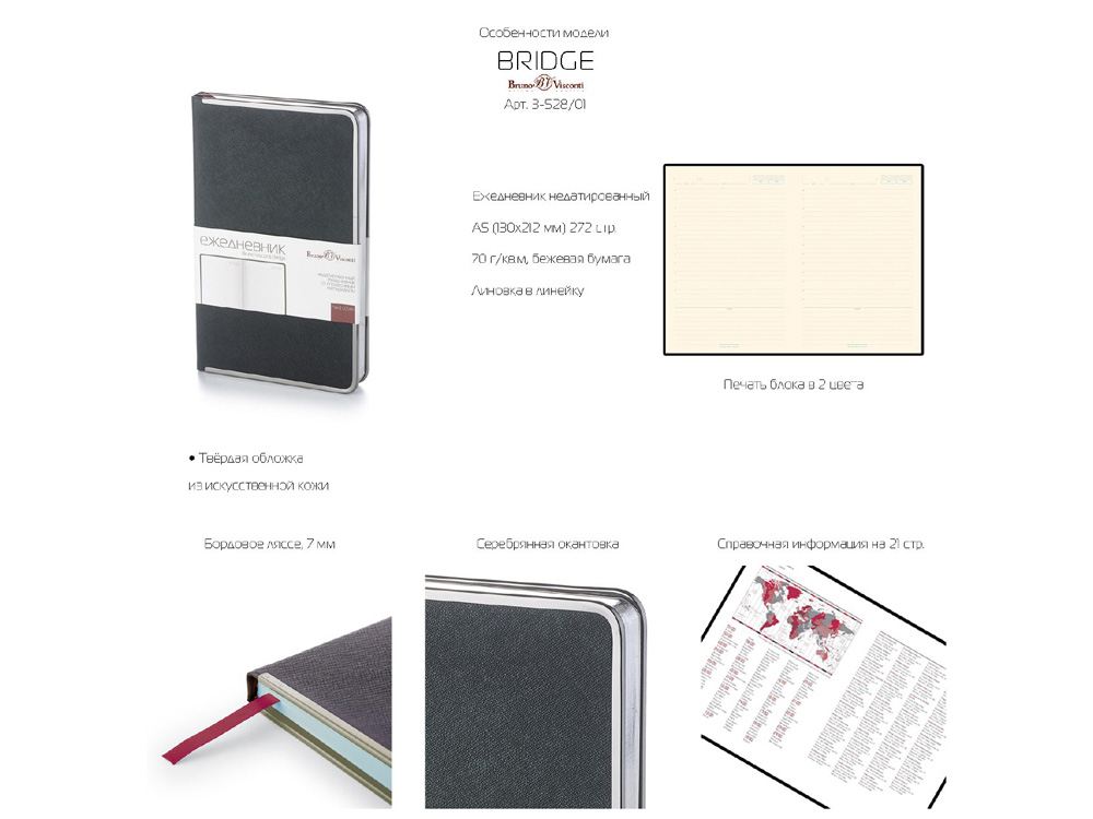 В ежедневнике Bridge есть полезная справочная информация на русском языке, а также 272 страницы для записи идей, мыслей и составления рабочих планов. День недели указан на английском языке. Для изготовления страниц используется качественный офсет, тонированного в кремовый цвет (70 г/кв м), который производится в Японии и подходит для всех видов чернил.