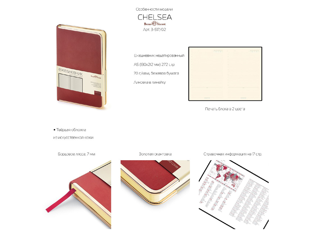 В ежедневнике Chelsea есть полезная справочная информация и телефонная книга, а также 272 страницы для записи идей, мыслей и составления рабочих планов. Есть закладка - тесьма из шелка, она интегрирована в обложку и может использоваться как хлястик. Для изготовления страниц используется качественный бежевый офсет повышенной плотности (70 г/кв м), которая производится в Японии и подходит для всех видов чернил. Бордовое ляссе, совпадающее по цвету с капталом, служит для удобного перехода к текущей дате.