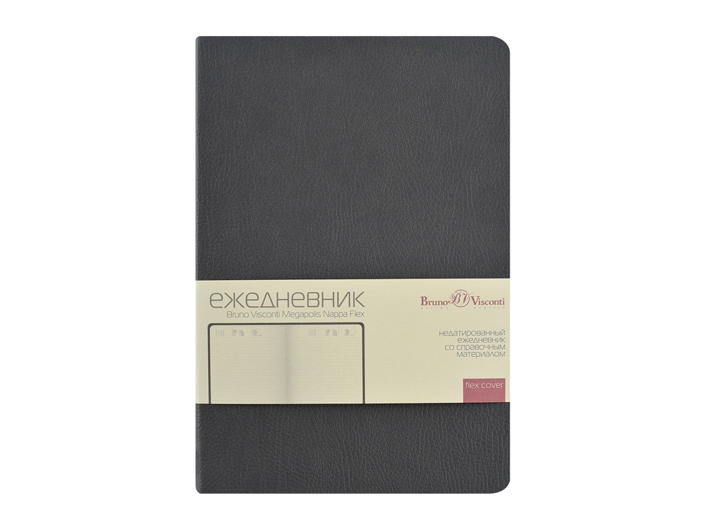 Обложка недатированного ежедневника Megapolis Nappa Flex ТМ Bruno Visconti произведена из искусственной кожи без применения переплетного картона, благодаря чему он легче и изящнее классических. Его можно свернуть в трубочку, обложка и блок не пострадают. При этом, для ежедневника формата А5 доступны те же опции, что и для любых других ежедневников — окрашенный обрез, крупнозернистая фактура искусственной кожи обложки, двойное ляссе 7 мм.