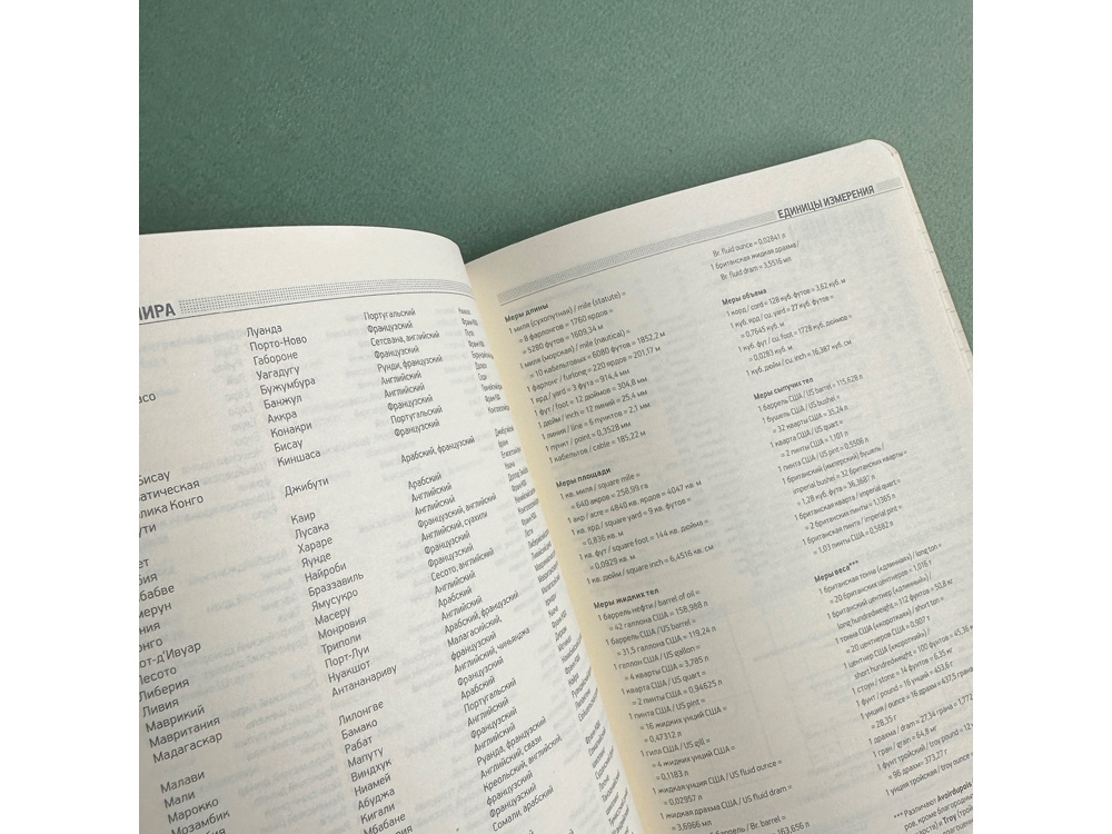 • справочная информация на 19 страницах (аэропорты Европы, штрихкоды, международные телефонные коды, цифровые автомобильные коды, энергетическая и питательная ценность продуктов, национальные и религиозные праздники, единицы измерения, страны мира, размеры одежды, форматы бумаги и др.);