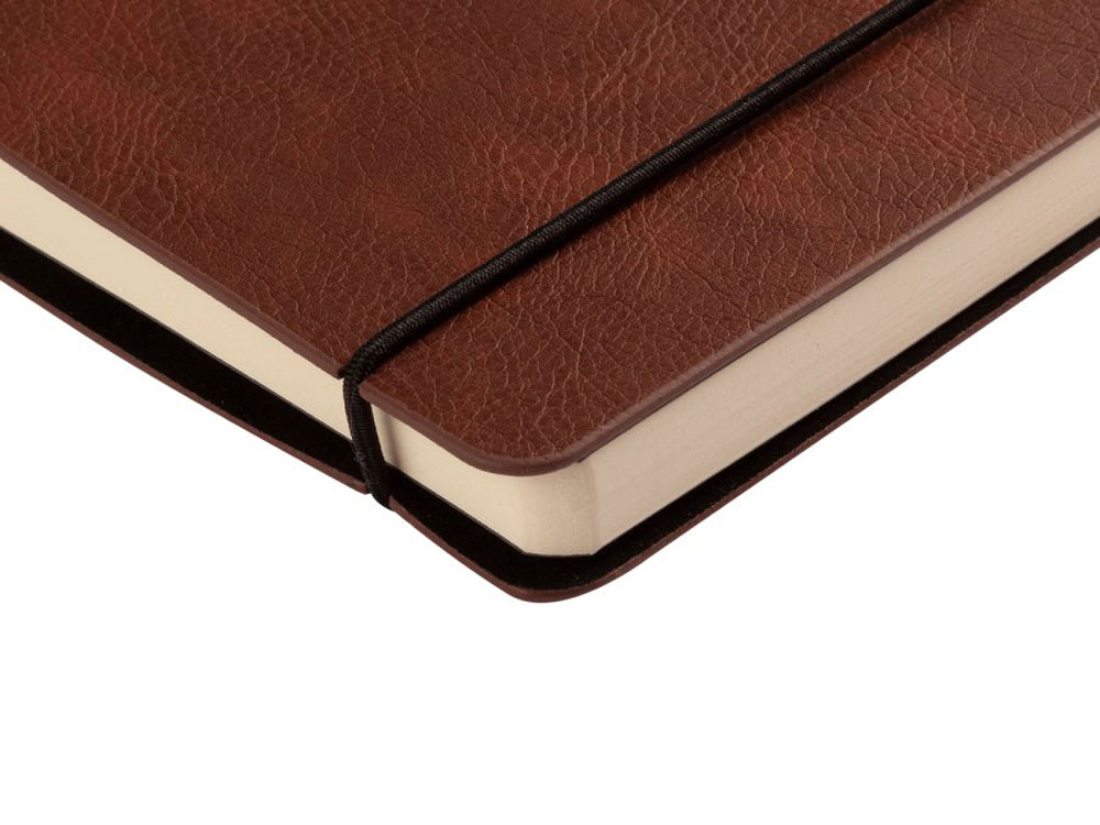 Отличительной особенностью ежедневника является горизонтальная, скрепляющая обложку и блок, тоненькая резинка. Оригинальное решение позволяет раскрывать ежедневник на 180 градусов и вести записи у самого края корешка. Для фиксации второй резинки, не позволяющей ежедневнику раскрываться, предусмотрена выемка на обложке. Обложка тонка, но фактурность придает ей элемент брутальности, а бархатистое нанесение на ее оборотной стороне- благородство и статусность. Картонный карман для визиток, записок, бумаг – функциональная деталь и приятная дополнительная опция. Бумажный блок изготовлен из бумаги бежевого цвета, плотностью 70 г/кв.м и содержит 272 страницы, 23 из которых справочная информация. -