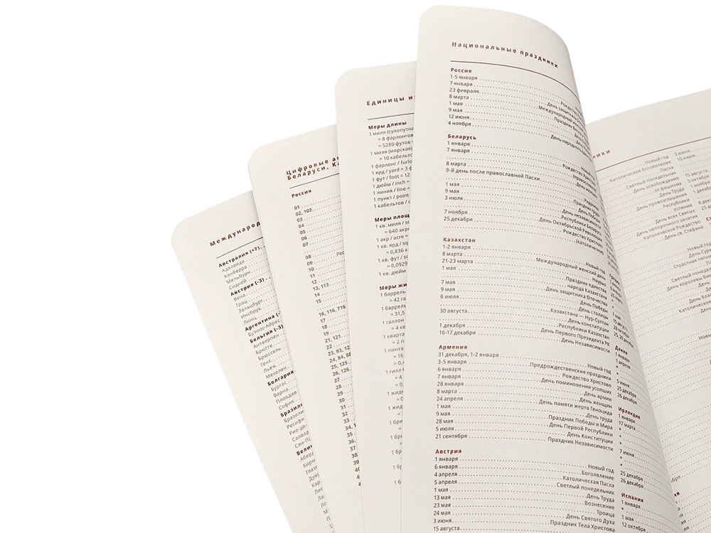 - раздел справочной информации на 17 страницах (часовые пояса, аэропорты Европы, международные телефонные коды, размер одежды, телефонные коды России, Беларуси, Казахстана, Армении, цифровые автомобильные коды, римские цифры, расход калорий при физической нагрузке, формат бумаги, десятичные приставки, единицы измерения, греческие буквы, штрихкоды, время распада алкоголя в крови, города-миллионники, национальные праздники, термины международной торговли, температура, скорость, давление, буквенные коды стран, энергетическая и питательная ценность продуктов, страны мира, заметки);