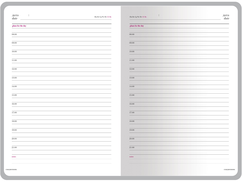 В ежедневнике Sidney Nebraska есть полезная справочная информация и телефонная книга на 18 листов, а также 272 страницы для записи идей, мыслей и составления рабочих планов. Для изготовления страниц используется качественный бежевый офсет повышенной плотности (70 г/кв м), который производится в Японии и подходит для всех видов чернил. Разметка блока с указанием времени позволяет планировать дела с точностью до 1 часа.