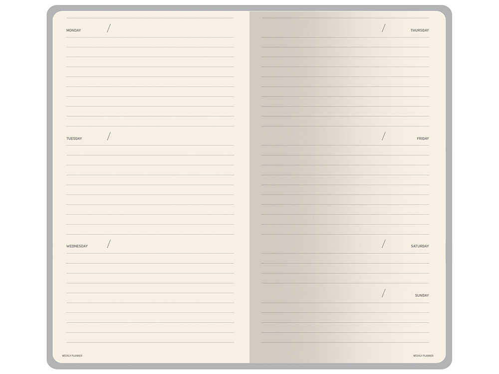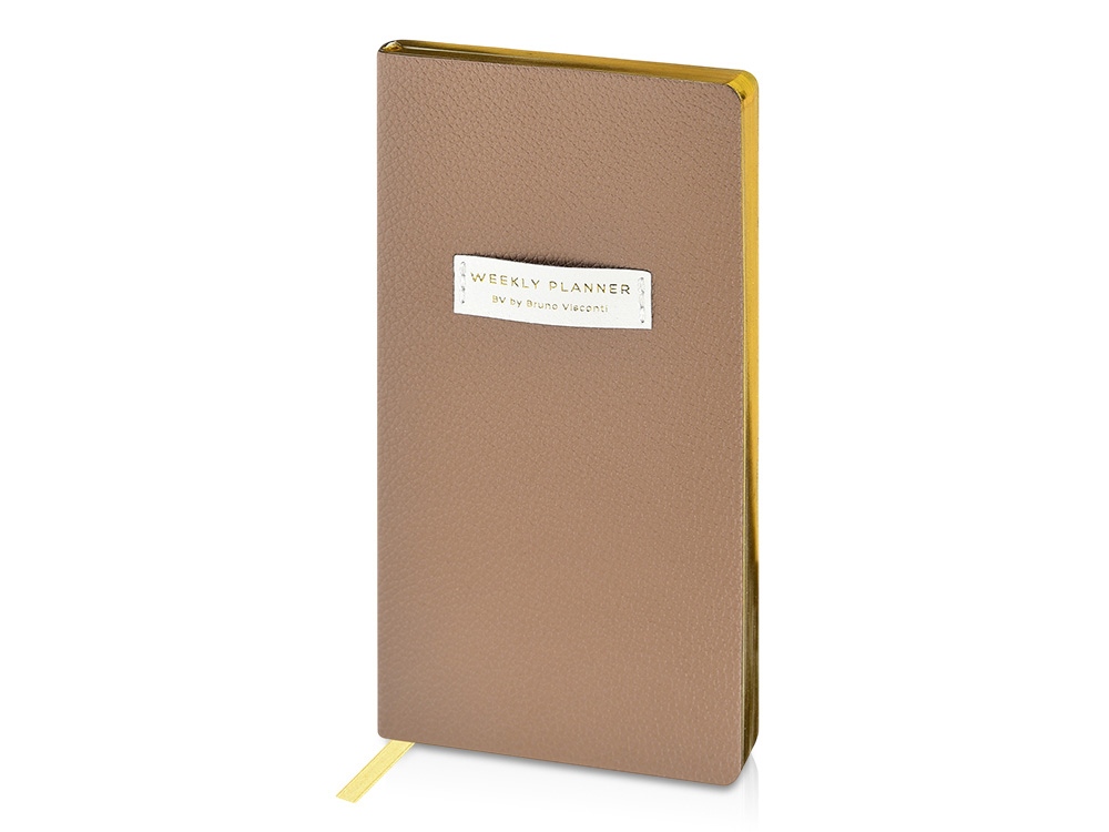 Внутри — недатированный блок формата А6 (84×160 мм) на бежевой бумаге 80 г/м². Книжный переплёт хорошо раскрывается, а скруглённые углы одновременно придают еженедельнику премиальный вид и защищают края при носке. Ляссе‑закладка выполнена в цвет обложки и помогает быстро находить нужную страницу. -