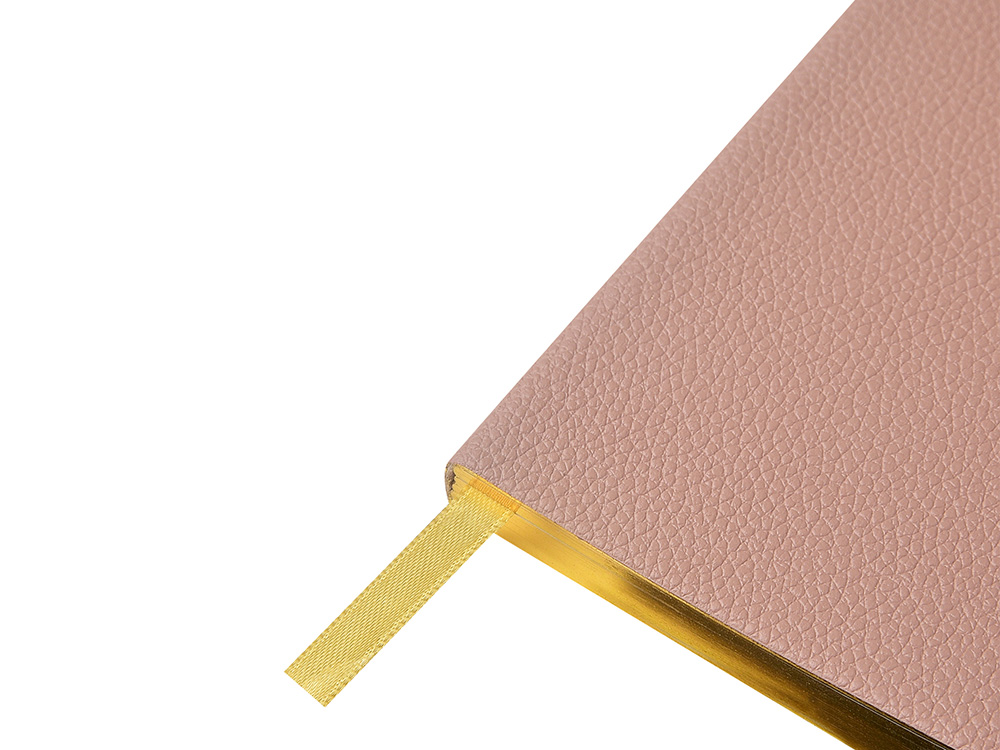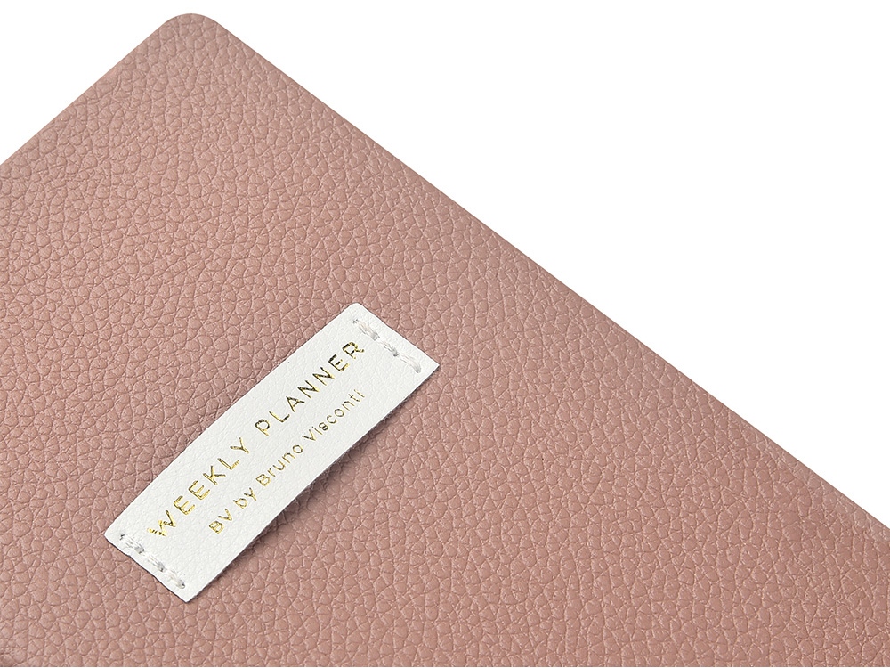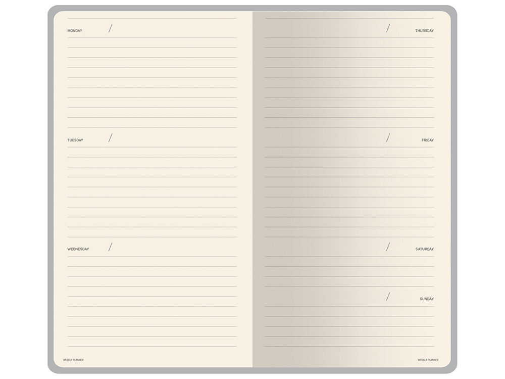 Внутри — недатированный блок формата А6 (84×160 мм) на бежевой бумаге 80 г/м². Книжный переплёт хорошо раскрывается, а скруглённые углы одновременно придают еженедельнику премиальный вид и защищают края при носке. Ляссе‑закладка выполнена в цвет обложки и помогает быстро находить нужную страницу. -