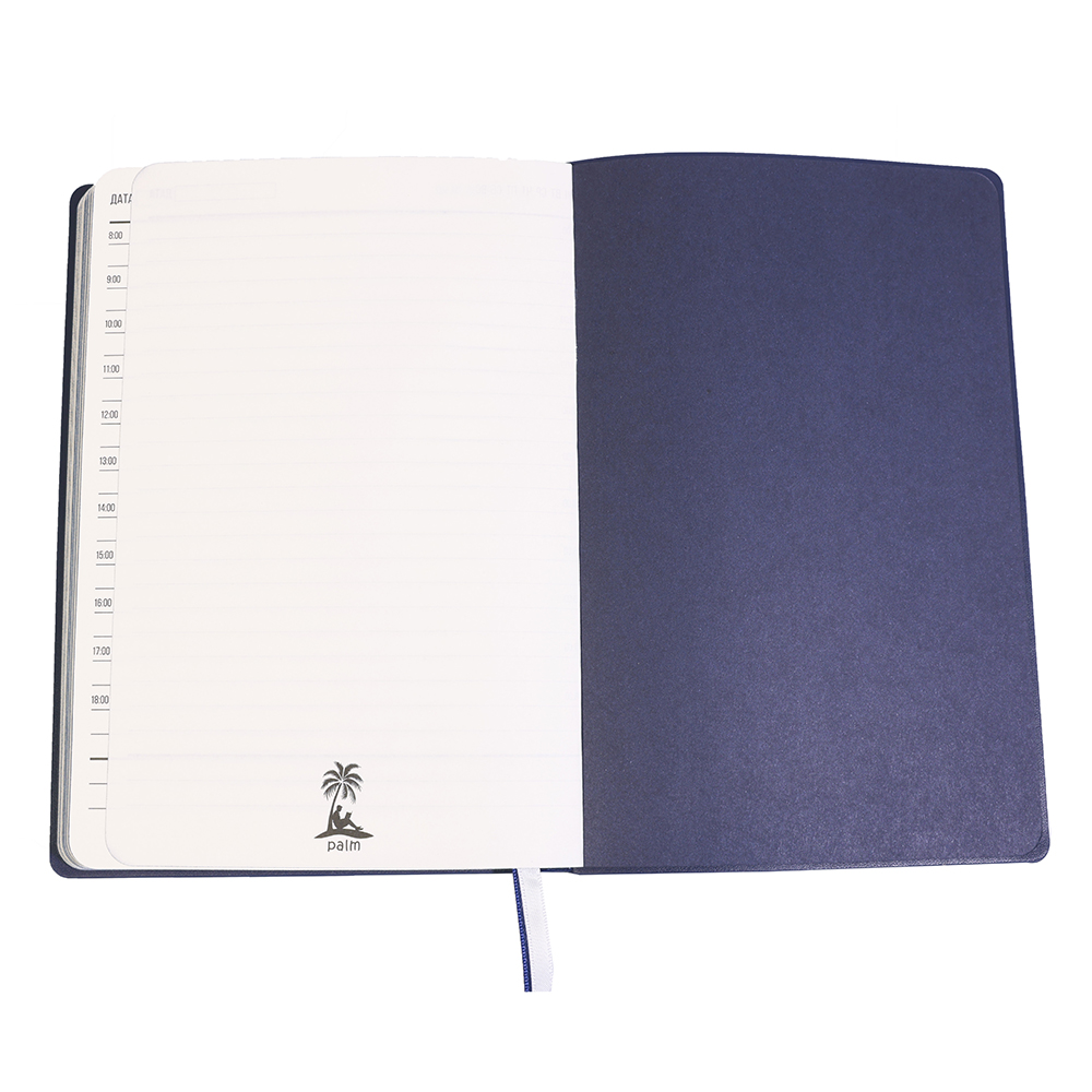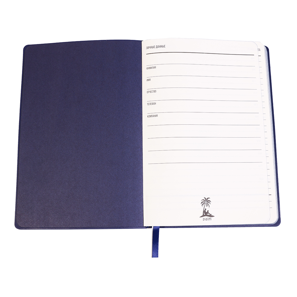 Высококачественный ежедневник Gabby в мягкой и приятной на ощупь обложке. Идеален для подарка! Удобный и стильный: закругленные углы, прокрашен в цвет ежедневника край, форзац и нахзац, а также одна из двух лент-закладок, вторая белая. Титульные листы — индивидуальные. Бумага в блоке — цвета слоновая кость. В начале ежедневника страничка с личными данными. Индивидуальная упаковка в термоусадочную пленку.Только вы, ваши мысли и PALM™. Блок внутренних страниц в линейку. Количество листов - 128.- Виды нанесений: УФ-печать А2, Тиснение, Тиснение фольгой, УФ-Лак, УФ-Цвет+Лак