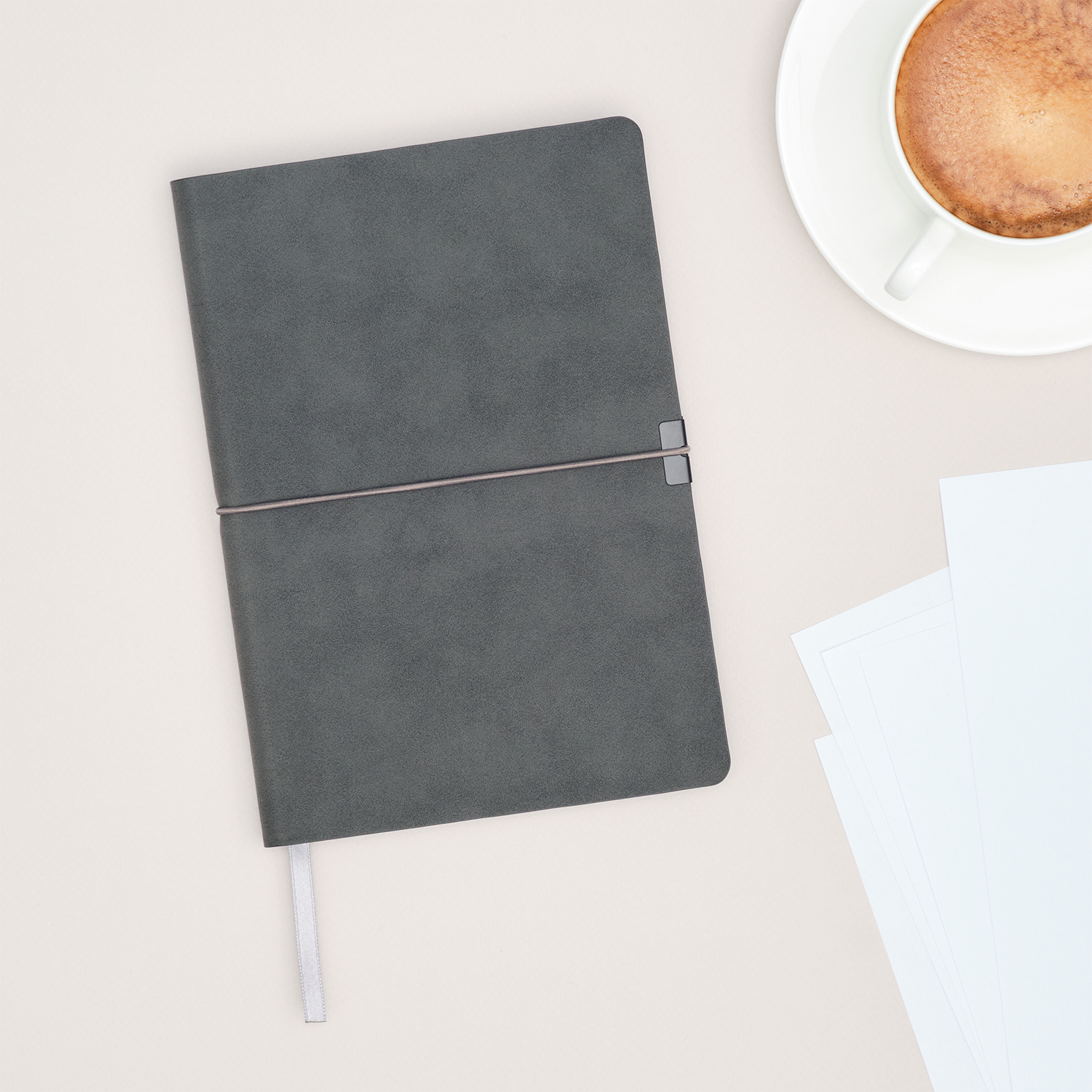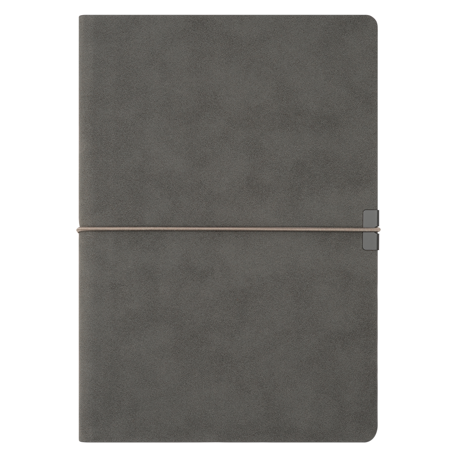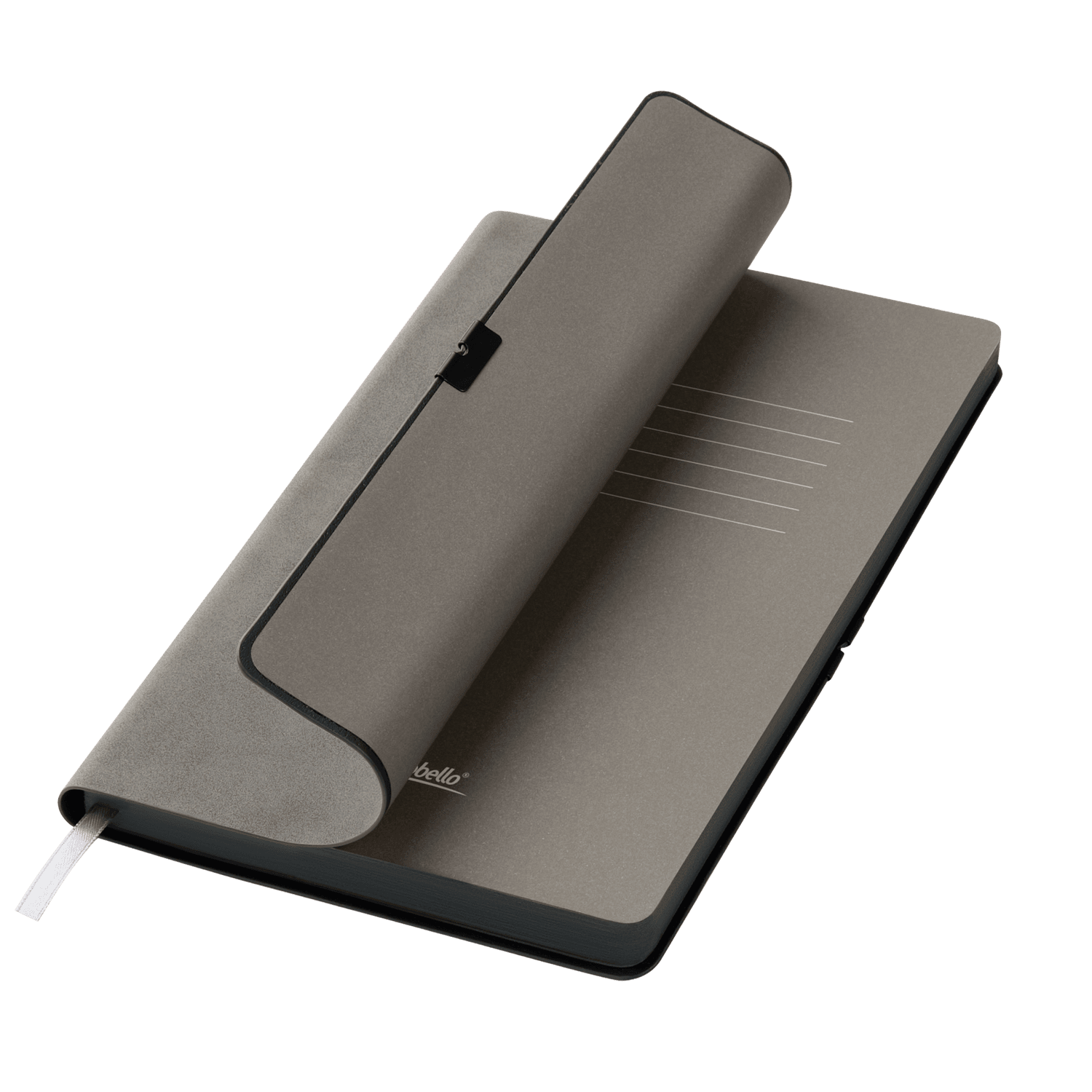 Горизонтальная резинка, фиксирующая обложку, дополнена металлическими элементами, которые не только защищают обложку от повреждений, но и служат стильным акцентом. Матовый срез в тон обложки и светло-кремовые страницы из гладкого, слегка шелковистого офсета подчеркивают изысканность дизайна. Атласное ляссе гармонично завершает образ этого элегантного ежедневника.