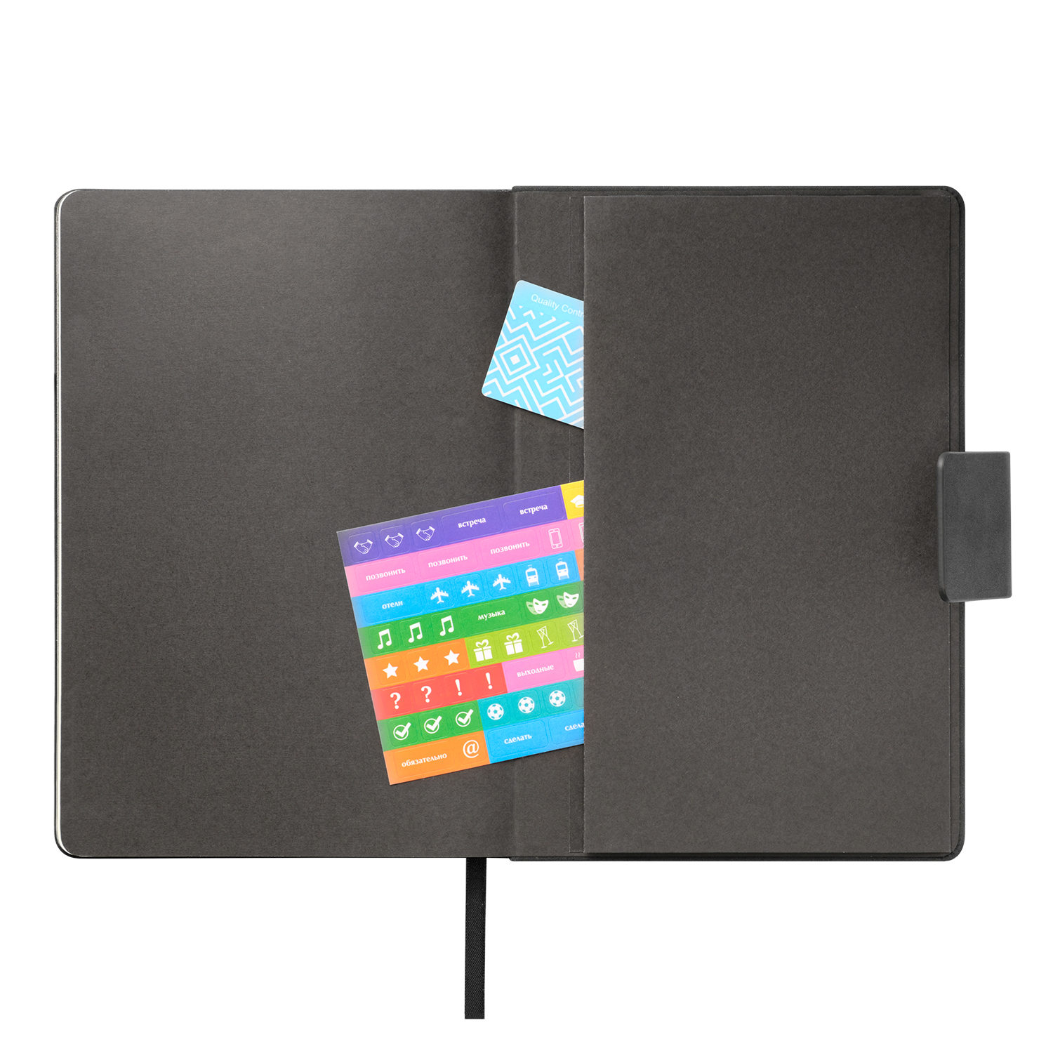 Оригинальный квадратный магнитный клапан надежно фиксирует обложку. Внутри — кремовые страницы из гладкого шелковистого офсета со скругленными уголками, форзац и нахзац, а также срез в тон обложки, создают гармоничное сочетание. Элегантное атласное ляссе дополняет изысканный образ.