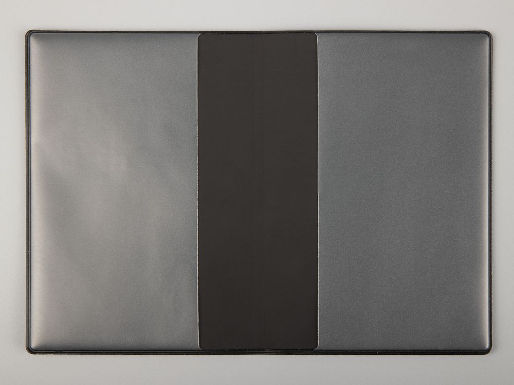 Снаружи обложка выполнена из материала с имитацией сафьяновой кожи, внутри — материал с эфффектом софт тач и кармашки из прозрачного ПВХ.