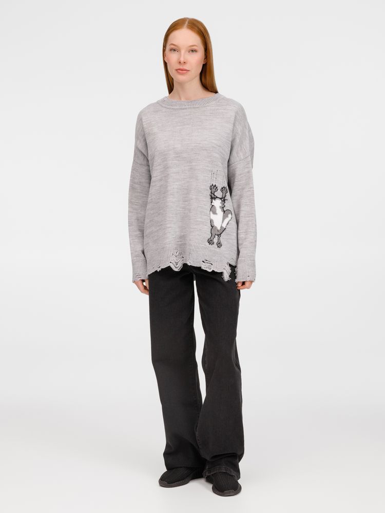 В дизайне мягкого джемпера с круглым вырезом Sharpick гранж-эстетика органично сочетается с милым акцентом — пушистым рисунком в виде озорного котика. Получается веселая вариация на тему того, откуда берется модная рваная одежда, а джемпер моментально создает настроение легкой несерьезности. Рваные края изделия добавляют современную нотку, а резинка на вороте, манжетах и по низу обеспечивает удобную посадку.