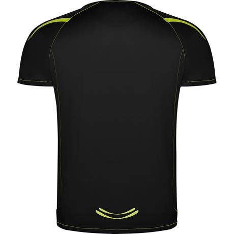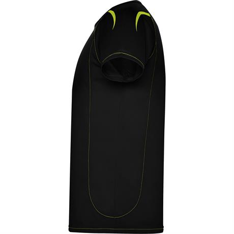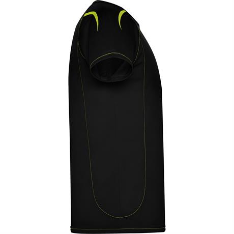 Спортивная футболка из одинарного трикотажа с короткими рукавами реглан. 1. Контрастные швы на манжетах рукавов, внизу, горловине и боках. 2. Горловина с окантовкой из той же ткани. 3. Дышащая ткань, легко стирается и быстро сохнет. 4. Светоотражающие де- Цвет: Черный