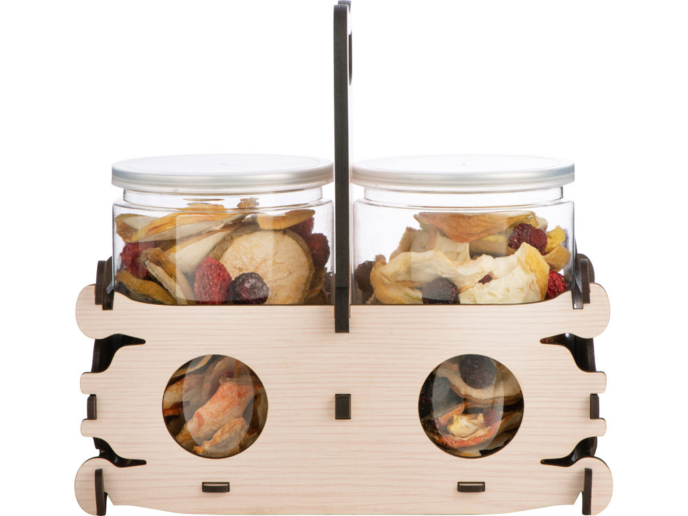 Мы красиво упаковали этот набор в корзинку-переноску из переработанной древесины, которую можно брендировать несколькими методами, и которая станет полезным, красивым и долговечным аксессуаром в доме. Чипсы упакованы в брендируемые наклейками пластиковые банки, которые можно использовать для хранения любых пищевых и непищевых предметов благодаря удобной форме и наличию плотно закрывающейся полиэтиленовой крышки.