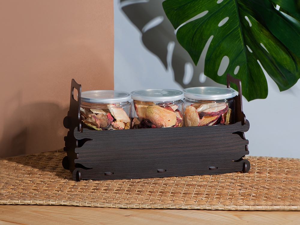 Мы красиво упаковали этот набор в корзинку-переноску из переработанной древесины, которую можно брендировать несколькими методами, и которая станет полезным, красивым и долговечным аксессуаром в доме. Чипсы упакованы в брендируемые наклейками пластиковые банки, которые можно использовать для хранения любых пищевых и непищевых предметов благодаря удобной форме и наличию плотно закрывающейся полиэтиленовой крышки.