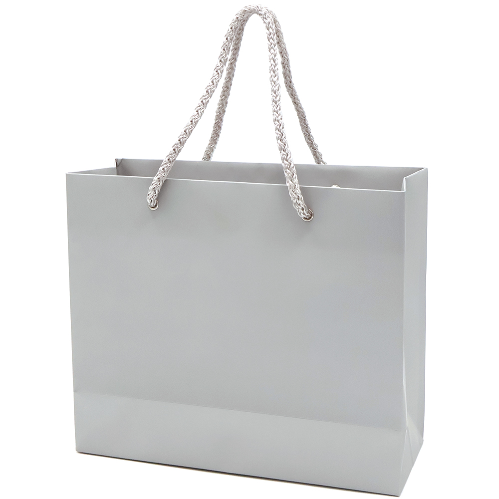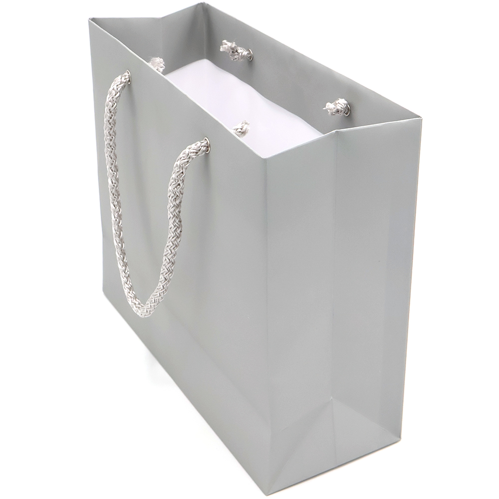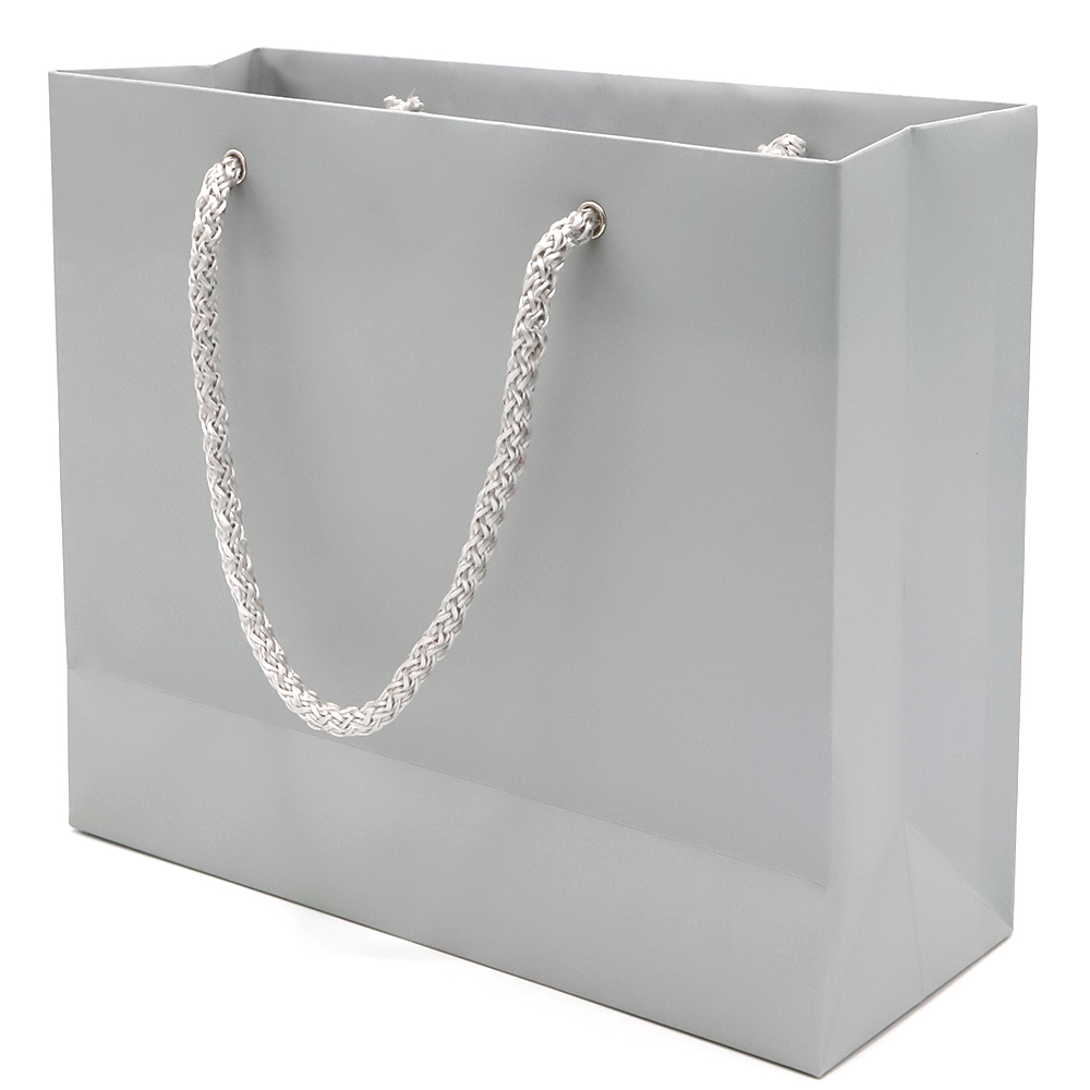 Бумажный цветной пакет плотностью 170 г/м². Покрытие софт-тач. Шнур 6 мм серого цвета. Люверс - серебристый.- Виды нанесений: Шелкография, УФ - DTF