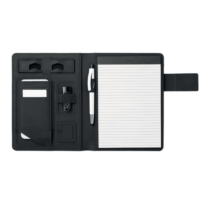 Папка формата А5 с аккумулятором ёмкостью 4000 мАч, подставкой для телефона или планшета, отделениями для ручек и карточек. Каждый лист разлинован и имеет календарь. Покрытие софт тач внутри, снаружи непромокаемый полиэстер. -